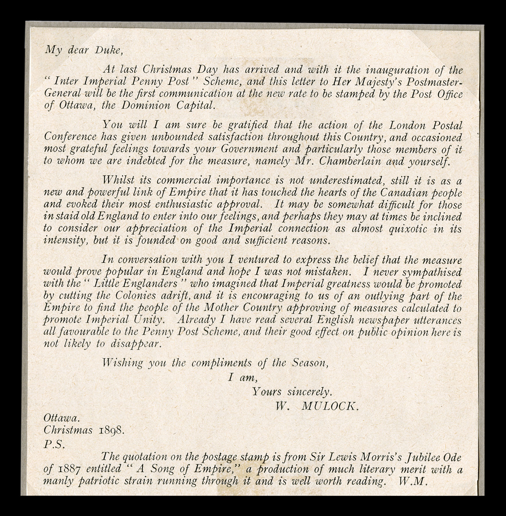 Penny Postage stamp, two double sheets with ms. letter encompassing sevSir William Mulock, Postmaster General of Canada, autographed letter signed, a most interesting and important historical document in relation to the Canadian 1898 2c Imperial Penny Postage stamp, two double sheets with ms. letter encompassing seven of the eight sides, datelined "Ottawa/Christmas 1898", to the Duke of Norfolk, the British Postmaster General, the subject of the letter is the congratulations to the Duke on the inauguration of the new Imperial Penny Post throughout the Empire and the letter starts, "At last Christmas Day has arrived and with it the inauguration of the "Inter Imperial Penny Post" Scheme, and this letter to Her Majesty's Postmaster General will be the first communication at the new rate to be stamped by the Post Office of Ottawa, the Dominion Capital...", attached to this letter is a 2c Black, lavender and carmine tied to a piece taken from the envelope used to send this letter on Christmas Day by a portion of the Ottawa duplex and showing a portion of the London receiving squared circle pmk., making this the first of the first day sendings on the inauguration of the Empire Penny Post rate, normal folds to the letter, very fine; a marvelous historical document of the greatest historical and philatelic importance for the 1898 Two Cent Imperial Penny Postage Stamp; ex-Bain. (imagea) (Image) Est. $4,000-5,000