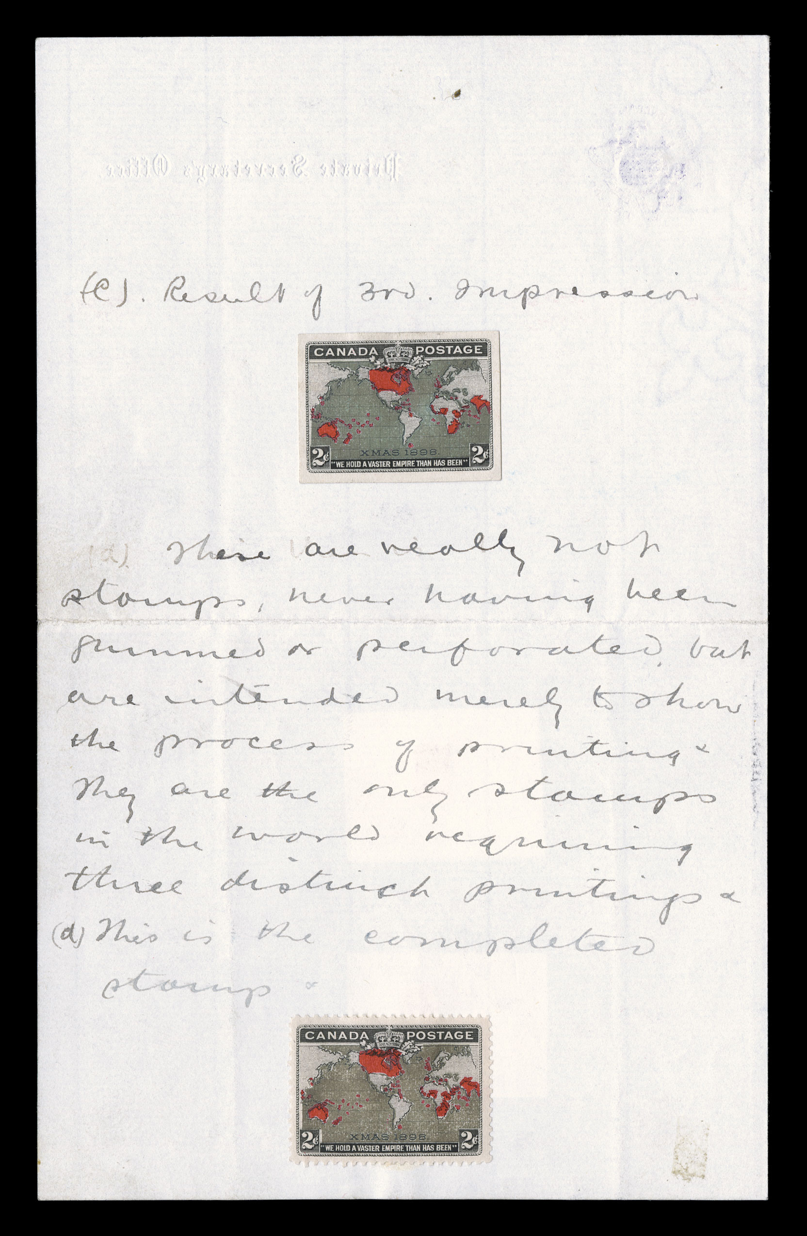 at left and colorless Private Secretarys Office embossed at right,Postmaster General's proof document addressing the production of the 1898 2c Imperial Penny Postage stamp, written on Postmaster General's stationery with violet embossed crest at left and colorless "Private Secretary's Office" embossed at right, affixed to the front and back is a set of three progressive plate proofs with handwritten explanation that the first impression was in black, the 2nd impression was the carmine of the the British possessions and the last impression adding the color for the oceans, the description concludes with "These are really not stamps, never having been gummed or perforated, but are intended merely to show the process of printing. They are the only stamps in the world requiring three distinct printings...", an issued stamp is shown at the end.The traditional theory, presented by Boggs, Volume I, p341, asserted that the black was printed first, then the oceans and finally the carmine. This document confirms beyond doubt that the carmine typographed plate was printed before the other typographed plate. This document was used as the basis of an article in Maple Leaves January 1993, Whole no. 241, pp9-11.This document was originally owned by Allen Whalen as a very young collector in his teens. In 1952 an Ottawa collector offered to trade a $10,000.00 house for the sheet, but Whalen refused. This was in the days when $10,000.00 was a lot of money. Regardless of the value, that collector knew that this unique proof document was a highly prized piece of postal history of the greatest rarity; ex-Bain. (imagea) (Image) Est. $10,000-15,000