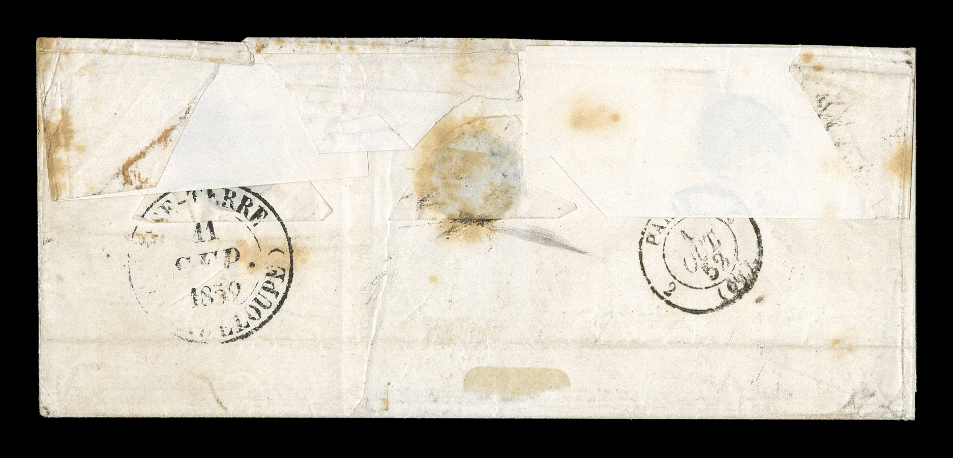 1852 folded cover to France, stamps tied on arrival in Paris by FreFrance Yvert #4, 6, 1849 25c Blue horizontal pair and 1Fr Carmine, attractive franking with rich colors, large margins to just in on one side of each, tied to exceptionally clean 1852 folded cover to France, stamps tied on arrival in Paris by French roller grill cancel, light but clearly discernible black "Grand-Bourg (Mie. Gte.)/Guadeloupe/27 Dec. 1852" double-circle c.d.s. above and similar Basse-Terre transit of December 31st at right, posted per British packet with red Calais entry transit and boxed "PD" handstamp, backstamped Paris, very fine and pretty cover; the small village of Grand Bourg is on the small island of Marie Galante located to the southeast of the two major islands of Guadeloupe, this sparsely populated island saw very little commerce in this period; this is the only recorded use of French stamps from Grand Bourg; 2002 A. Roumet certificate. (imagea) (Image) Est. $5,000-7,500
