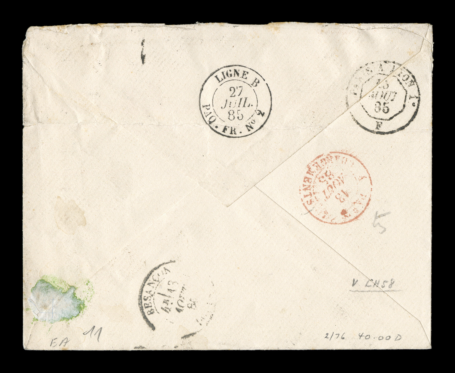 U.P.U. rate and 25c registry fee, stamps tied by GuadeloupePointe-a-PFrench Colonies Yvert #50, 57, 1881 10c Black on lilac and 40c Red orange, a handsome franking of the Dubois issue tied to rare 1885 registered cover to France paying the 25c U.P.U. rate and 25c registry fee, stamps tied by "Guadeloupe/Pointe-a-Pitre/24 Juil. 85" double-circle c.d.s. with additional strike at left, attractive "R" registry boxed handstamp on the front, carried by French packet with Line "B" transit on the reverse along with red "Paris/Chargements/13 Aout 85" entry c.d.s., backstamped Basancon, light horizontal fold of no consequence, a very fine and pretty cover. (imagea) (Image) Est. $500-750