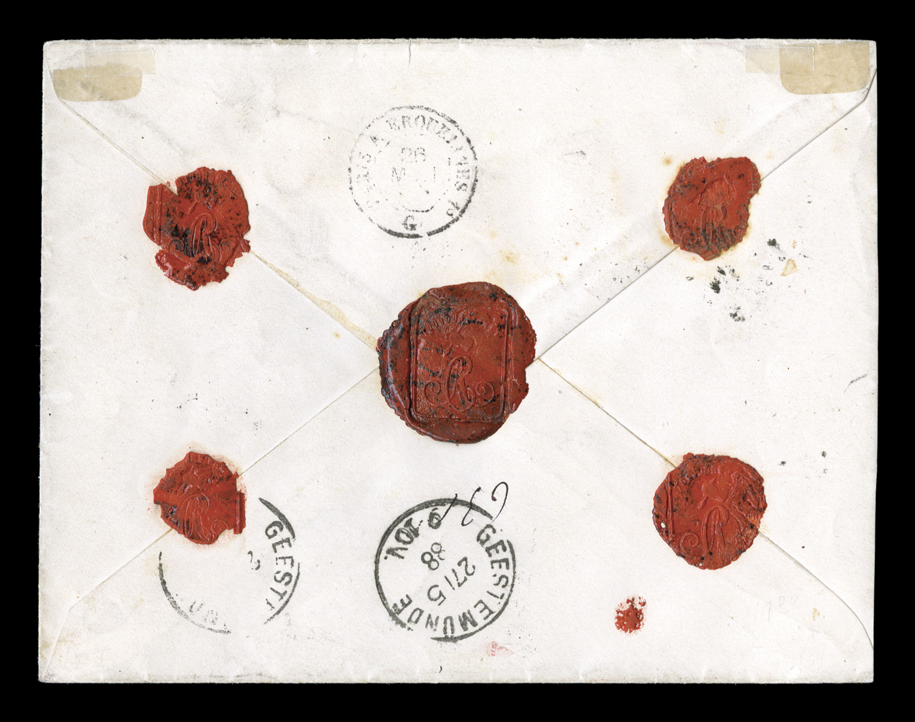 paying 50c postage and 25c registry fee, stamps tied by light strikes ofFrench Colonies Yvert #51, 52, 1881 15c Blue and 20c Brick red on green strip of three, well centered and attractive franking on double rate 1888 registered cover to Germany paying 50c postage and 25c registry fee, stamps tied by light strikes of "Guadeloupe/Basse Terre/11 Mai 88" double-circle c.d.s. with additional strike at right, "R" boxed registry handstamp, Calais-Paris transit, backstamped Gestemunde and nice wax seals on the reverse, very fine; an unusual and scarce Dubois franking on rare double rate cover. (imagea) (Image) Est. $400-500