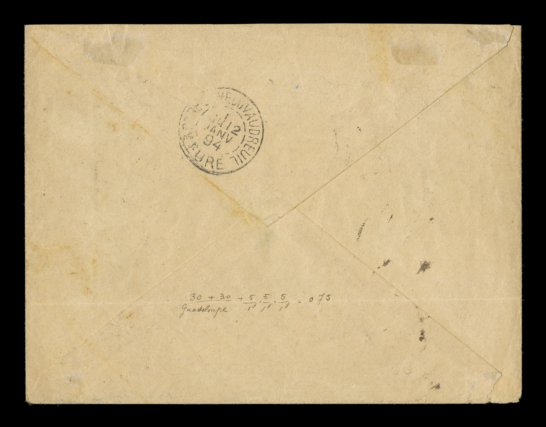 the left stamp with spelling error Guadelonpe, all are qYvert #11, 22, 22c, 1889 "5c/GPE" Provisional surcharge on 1Fr Olive horizontal pair and single along with a horizontal pair of 1891 30c Brown with provisional "Guadeloupe" overprint, the left stamp with spelling error "Guadelonpe", all are quite well centered and attractive, tied to 1893 registered cover to France by "Guadeloupe/Point a Pitre/27 Dec 93" double-circle c.d.s. with additional strike below, matching "R" boxed registry handstamp, backstamped Vaudreuil, very fine; a scarce franking paying double rate postage of 50c and 25c registry fee. (imagea) (Image) Est. $500-750