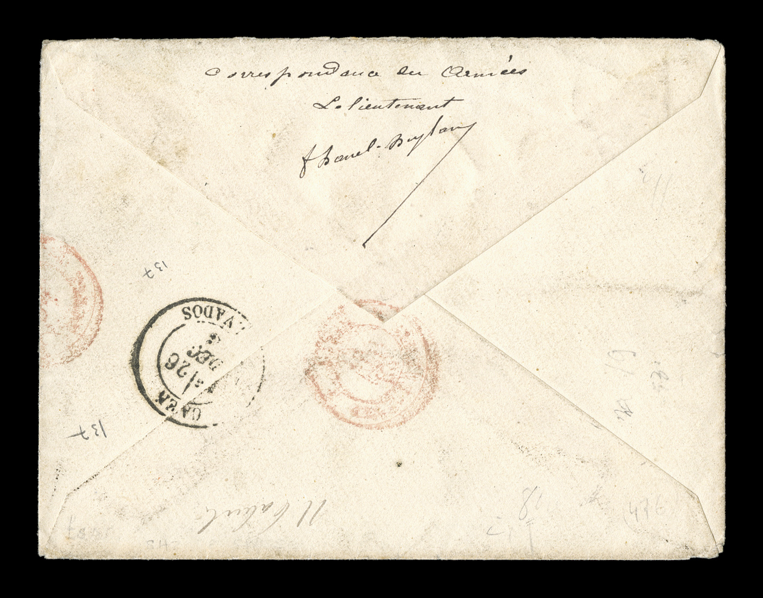 margins and the later 25c Dubois issue, both tied to lovely military coveFrench Colonies Yvert #19, 52, 1877-81, 15c Bister and 25c Bister yellow, an impressive and exceptionally rare mixed issue franking of the 15c large numeral Ceres with four margins and the later 25c Dubois issue, both tied to lovely military cover by "Guadeloupe/Basse Terre/6 Dec 83" double-circle c.d.s., at left is a lovely strike of the rare "Corr. D. Armees/Basse Terre/6 Dec. 83" octagonal military c.d.s. with inverted month plug, black French packet Line "A" and red Paris transits on the front, backstamped Caen, military manuscript endorsement on the reverse, a very attractive cover with all markings well struck and clear; extremely fine; a most unusual and rare franking, not only in its combination of issues, but in paying the 25c registry fee along with the 15c military concessionary rate; a great rarity being the only registered military cover with French General Colonies issues recorded to date from Guadeloupe; ex-Levett. (imagea) (Image) Est. $3,000-4,000
