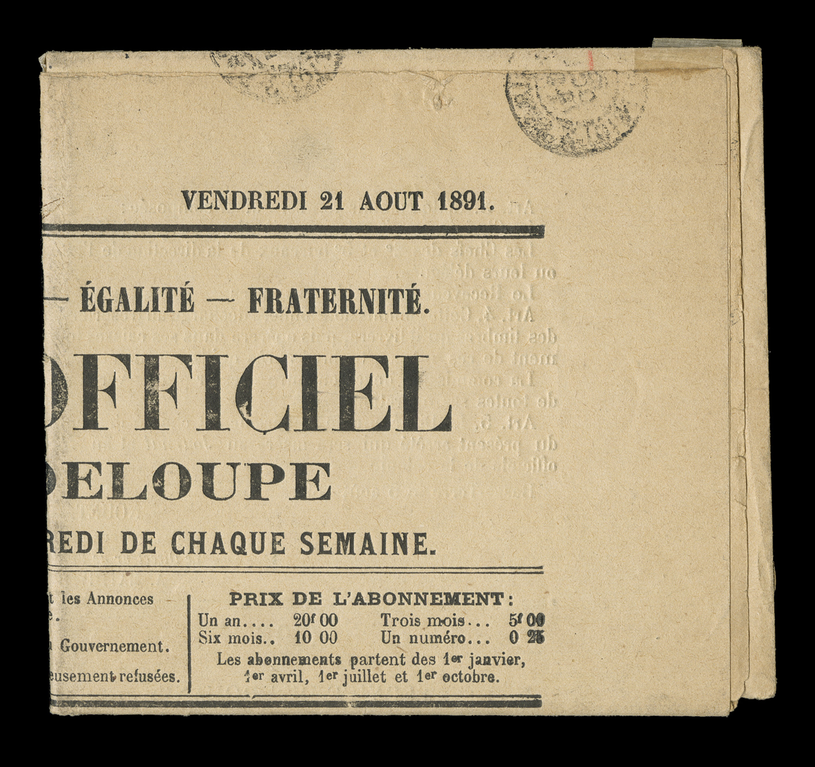 Official de la Guadeloupe, paying the 5c printed matter rate to FFrench Colonies Yvert #51, 1881 15c Blue, lovely well centered left sheet-margin pair, fresh and well centered, a wonderfully rare franking tied to entire 1890 newspaper, "Journal Official de la Guadeloupe", paying the 5c printed matter rate to France plus the 25c registry fee, something that was almost never done with newspapers, pair is tied by black "Guadeloupe/Basse Terre/28 Aout. 91" double-circle c.d.s. to small piece of newspaper band that still remains, most having been taken off when the paper was opened to read, the newspaper is a complete August 21,1891 issue, backstamped Paris, very fine; posted complete newspapers are extremely scarce but truly rare when registered. (imagea) (Image) Est. $300-400