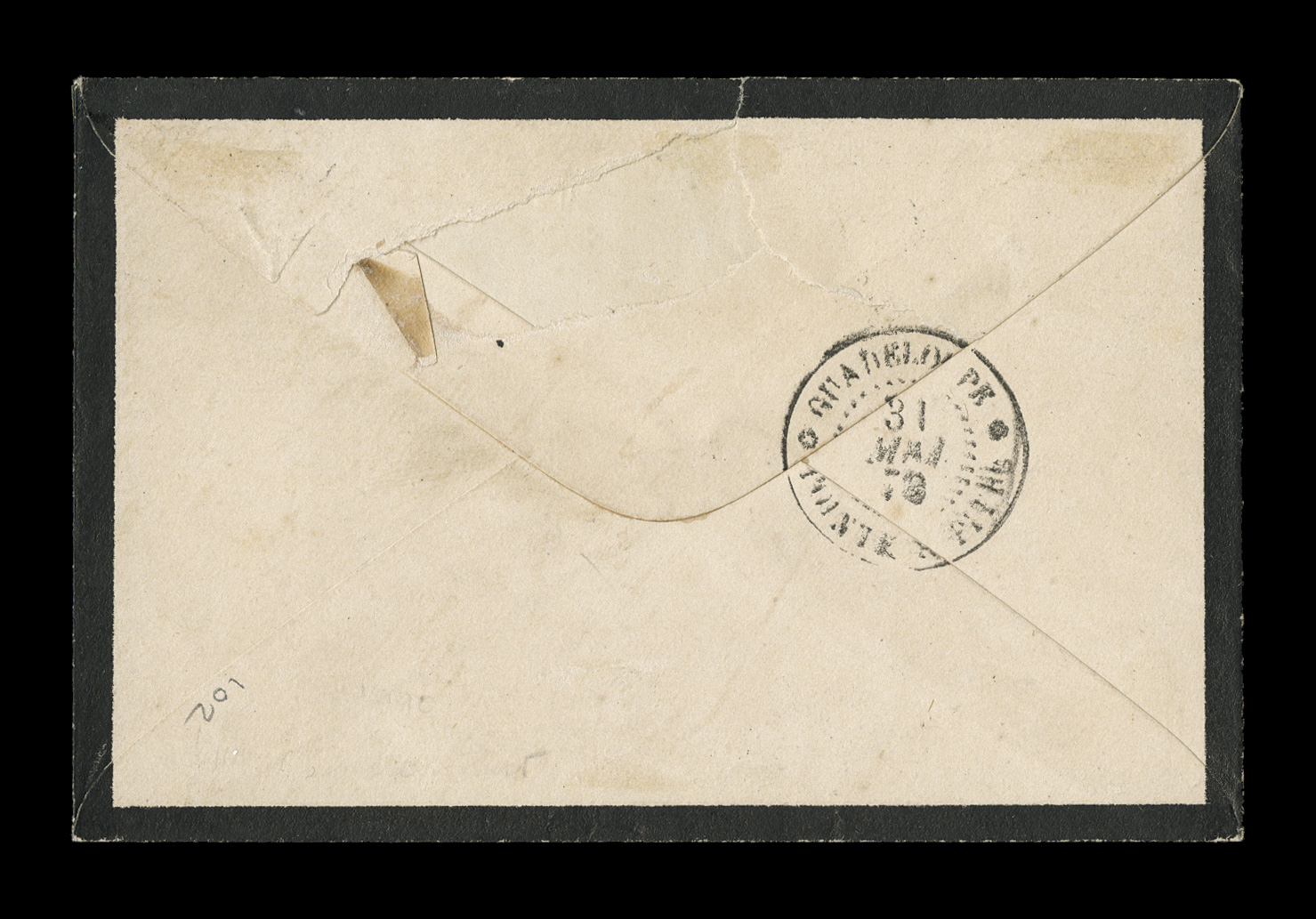 Capesterre, stamp tied by black GuadeloupeCapesterre30 Mai 79 dFrench Colonies Yvert #34, 1877 20c Lilac brown on buff, Ty. II, single franking with four clear to large margins on small 1879 domestic mourning cover from the small town of Capesterre, stamp tied by black "Guadeloupe/Capesterre/30 Mai 79" double-circle c.d.s. with additional clear strike at left, backstamped Pointe-a-Pitre, small piece missing from backflap causing a trivial tear at top, very fine; a rare cover from this little village with proper Sage single franking; ex-Levett. (imagea) (Image) Est. $750-1,000