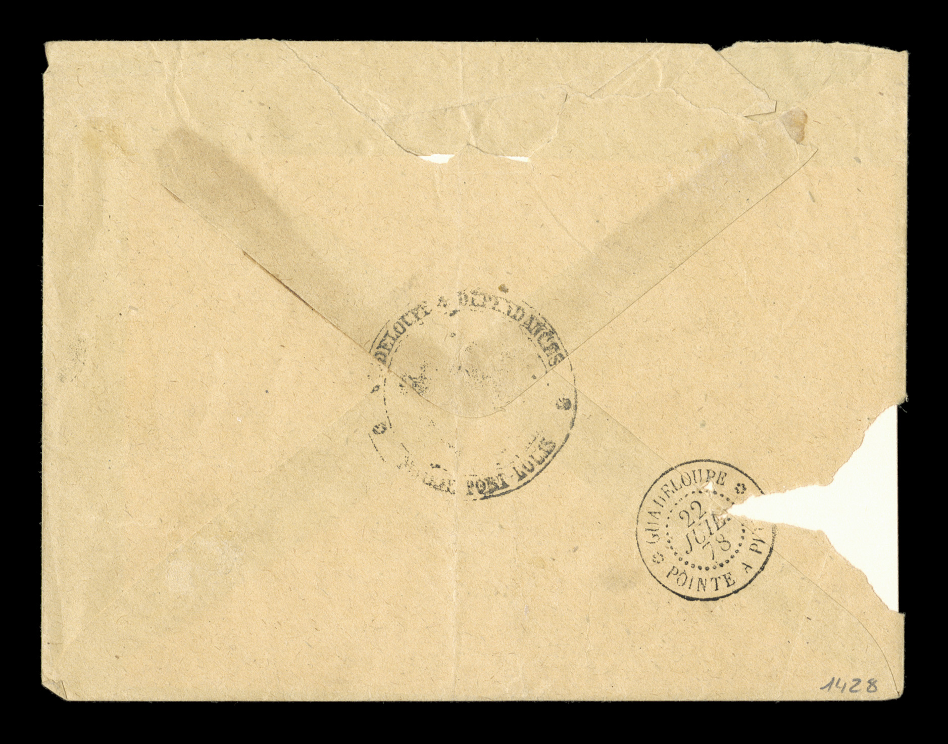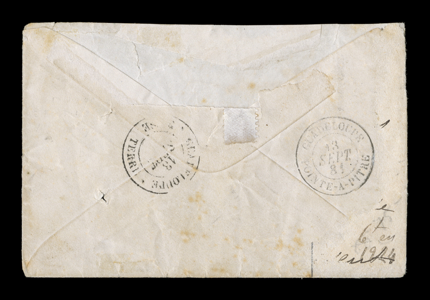 rare black GuadeloupeSaintes (T.DE.H.)12 Sept. 80 double-cirFrench Colonies Yvert #34, 1877 20c Lilac brown on buff, mostly clear to large margins, tied to small 1881 cover to Pointe-a-Pitre from Terre de Haute in the Saintes Islands, by rare black "Guadeloupe/Saintes (T.DE.H.)/12 Sept. 80" double-circle c.d.s. with parenthesis around the town designation, additional strike at left, Basse Terre transit and backstamped Pointe-a-Pitre, backflap missing and edge repair at top plus unobtrusive spindle hole, none of which affect the stamp or markings, a fine cover from these out-of-the-way islands and exceptionally rare with this postmark which was noted when offered in the Dubus sale as being one of only two examples known; ex-Dubus. (imagea) (Image) Est. $1,000-1,500