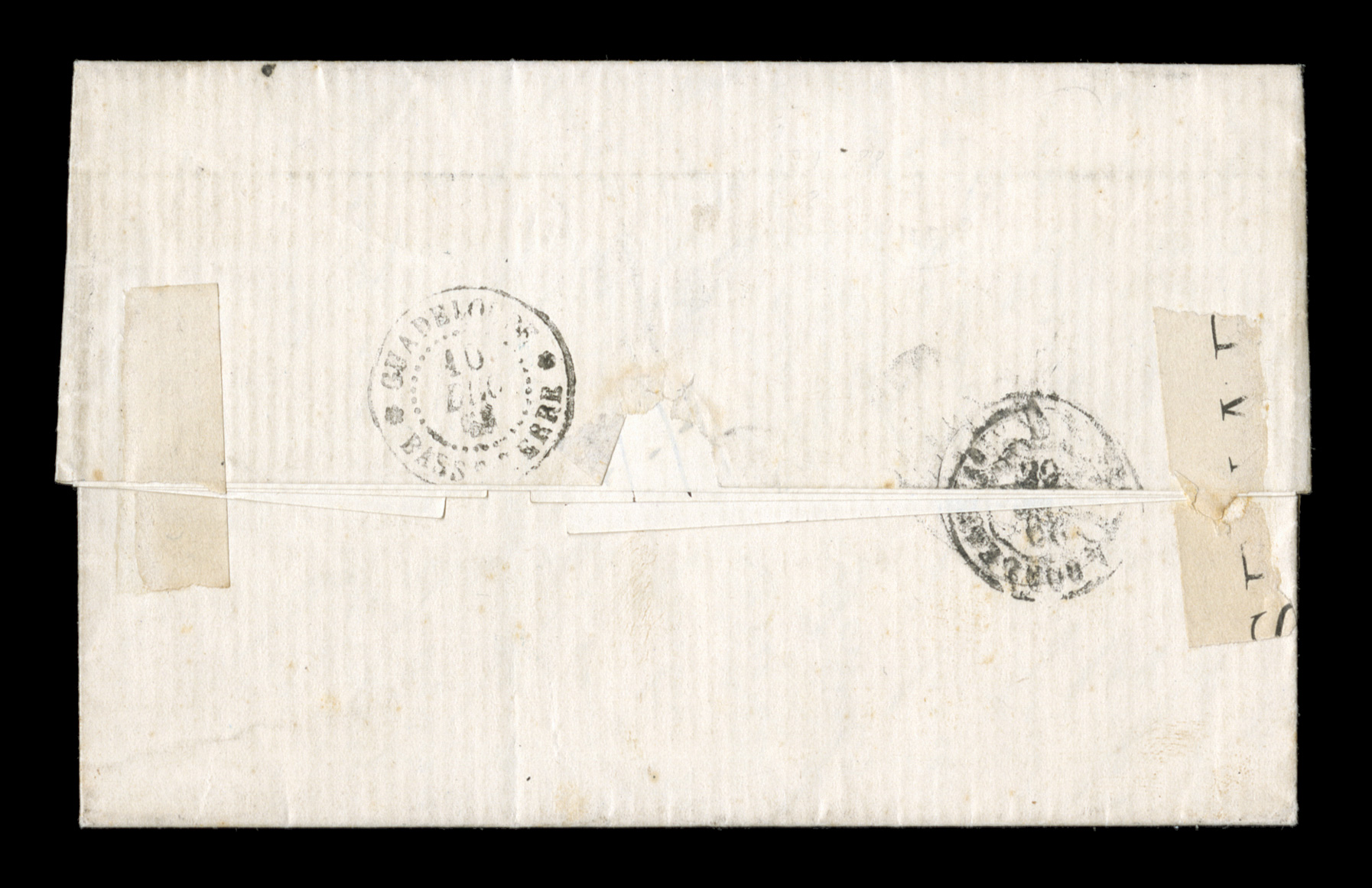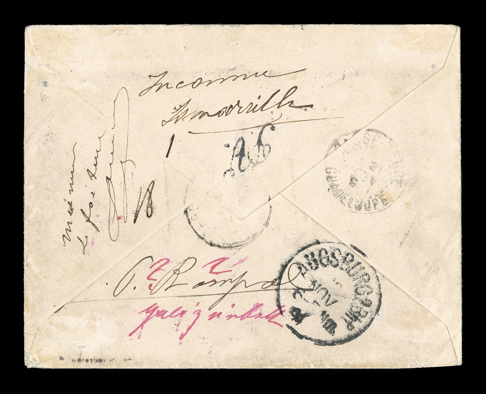 quadruple 80c domestic rate on the first leg of this cover from PointeFrench Colonies Yvert #5, 1859 40c Vermilion vertical pair, exceptionally choice with large to extra-large margins, tied to an amazingly rare turned linen cover paying the quadruple 80c domestic rate on the first leg of this cover from Pointe-a-Pitre to Trois Rivieres, pair tied by black 8x8 point lozenge cancel, with matching "Pointe-a-Pitre/Guadeloupe/18 Sep 1864" rimless c.d.s. plus large red "P.P" boxed handstamp, immediately upon arrival the envelope was opened out and turned and re-posted back to Pointe-a-Pitre from the small village of Trois Rivieres, franked with a handsome 10c Bister horizontal strip of four (French Colonies Yvert #3), tied to the linen side of the cover by neat 7x7 point black lozenge cancels with full and exceptionally rare strike of "Trois-Rivieres/Guadeloupe/21 Sep 1864" rimless c.d.s., this franking paying the 40c double domestic rate, both sides are extraordinarily high quality and attractive; extremely fine; an amazing cover that is actually the listing example for the rare rimless Trois Rivieres postmark in the Dubus book, but more significant is that this is the only recorded turned cover of any of the French Colonies, and that each posting is a spectacular and rare Eagle usage just adds to the stunning affect of this cover; ex-Dubus. (imagea) (Image) Est. $7,500-10,000
