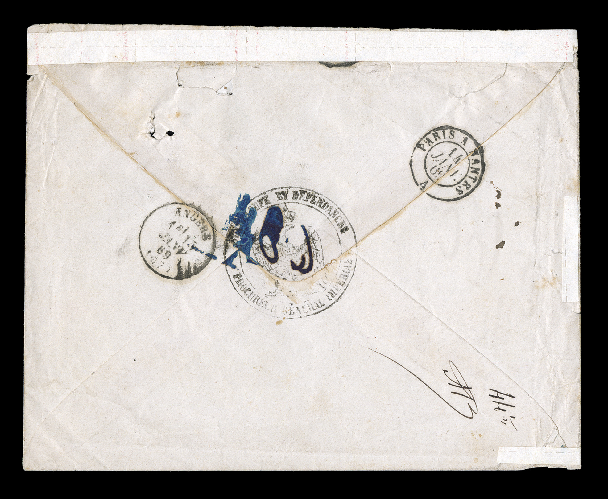 General handstamp on front with manuscript endorsement as well as1869 Basse Terre unpaid official cover, interesting sending to France via French packet with black "Guadeloupe/Basse-Terre/9 Dec." double-circle c.d.s. without year date, Procureur General handstamp on front with manuscript endorsement as well as official cachet on reverse, applied apparently in an attempt to invoke government franchise for the sending, however this was not recognized by France and the normal 60c due for an unpaid British packet cover was charged, edge wear causing tears and spindle holes, backstamped Angers, fine and unusual usage. (imagea) (Image) Est. $400-500