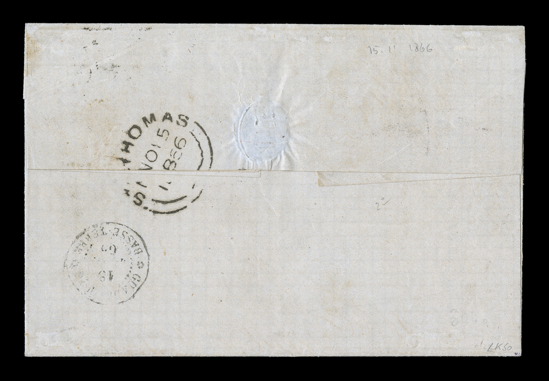 double-arc c.d.s. on the reverse, posted to Pointe-a-Pitre with a BaGreat Britain #Z28, 1865 1/- Green, plate 4, used from St. Thomas, D.W.I., single tied to 1866 entire folded letter by bold "C51" in oval of bars cancel, "St. Thomas/NO 15 1866" double-arc c.d.s. on the reverse, posted to Pointe-a-Pitre with a Basse Terre transit on the reverse, on arrival bold "12" handstamp for 12 decimes due (1Fr20c), closed tear to cover at right not affecting stamp or markings, very fine; a most unusual inbound postage due cover, it is not clear why with the high amount paid at the British Agency in St. Thomas that so much postage due would be required on a posting from a relatively close Island, but this interesting and rare cover illustrates the complexities of mail carried throughout the Caribbean at this period; 2004 RPS certificate. (imagea) (Image) Est. $1,000-1,500