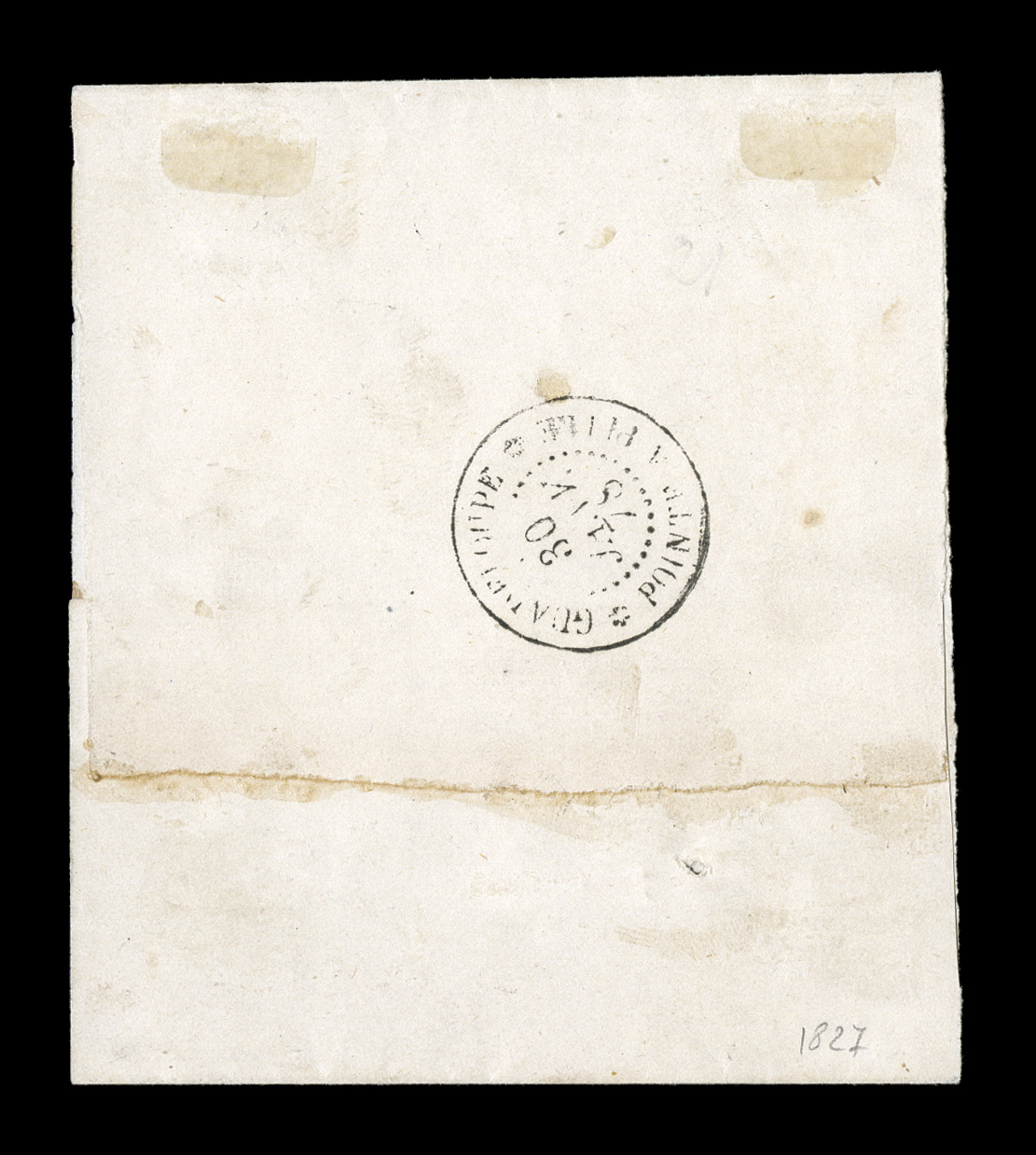 the same correspondence as the previous cover from the tiny town ofYvert TT#2, 1876 40c Black on blue first typeset postage due, a choice single franking of this rarity with large balanced margins all around, tied to 1878 legal papers wrapper of the same correspondence as the previous cover from the tiny town of Lamentin, black "Guadeloupe/Lamentin/30 Janv. 78" double-circle c.d.s. applied at posting to Pointe-a-Pitre, stamp is tied by gorgeous strike of "Guadeloupe/Pointe-a-Pitre/30 Janv. 78" double-circle c.d.s. with a second strike on the reverse as a backstamp, bold "4" handstamp for 4 decimes due, exceptionally choice quality of both the stamp and wrapper, extremely fine.This wrapper was sent a month and a half after the previous large wrapper and the twenty copies of the 40c Black on blue paper had not yet been exhausted at Pointe-a-Pitre. What had changed was the rates for this class of mail. In 1878 Guadeloupe instituted a two tier system with different rates for postings within the same postal district and those from district to district. Lamentin was considered to be in a different district than Pointe-a-Pitre and the rate had been increased from 25c to 40c for the first weight class of up to 15 grams. This petite wrapper was charged the single rate of 40c under this new system.This phenomenally rare postage wrapper exhibits a sole single franking of the rare 40c Black on blue paper. Only in the second rate period can a single franking be properly used as the other single rates in first period and the same district single rate in the second period are both 25c or multiples of 25c up to 50 grams. There is one rate in the third period where a single 40c could be used but by December 1878 all the 40c Black on blue had been used up. Dubus in his 1958 handbook records only three such usages of this rare stamp in 1878, and the example offered here is much superior to the example he illustrates - if not the finest of the three. This lovely and important cover has been examined by a myriad of experts and is signed by R. Calves, P. Dillemann, Roumet, L. Miro and others. (imagea) (Image) Est. $30,000-40,000