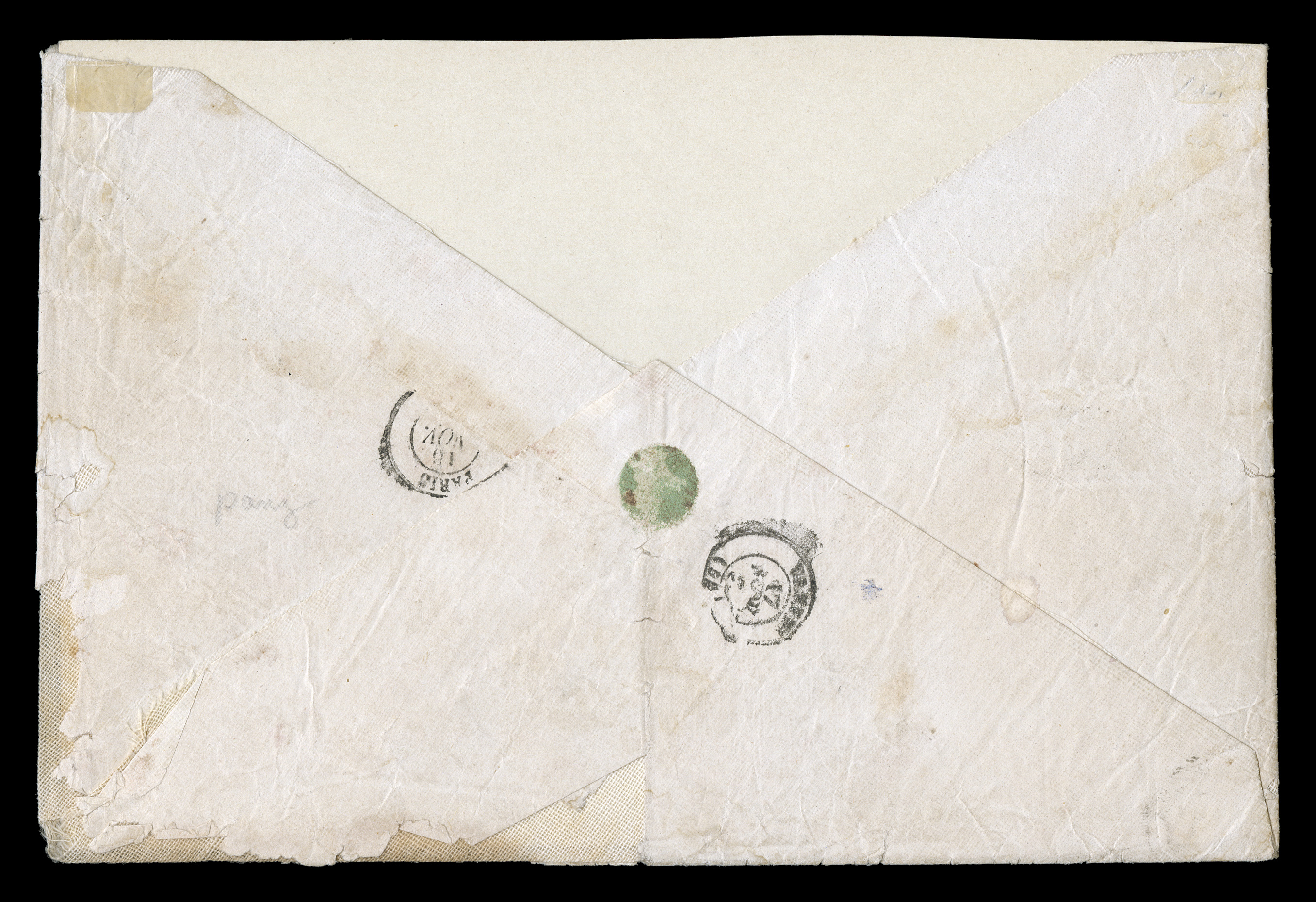 23 c 1854 Saint Francois unpaid stampless cover to France, extraordinarily rare black St. FrancoisGuadeloupe25 Sep 1854 double-circle c.d.s. on folded cover (missing side flaps) from