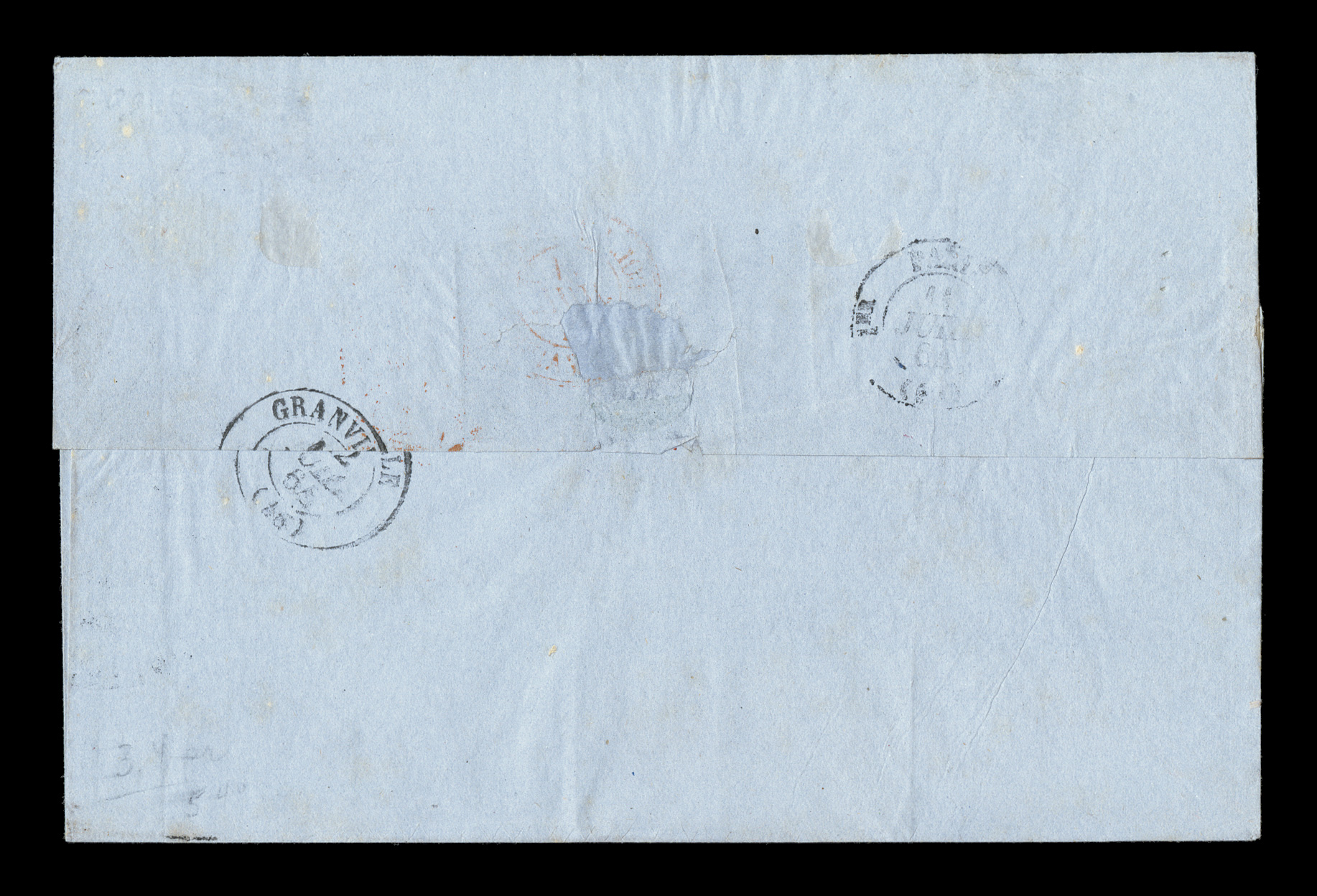 matching black Pointe-a-PitreGuadeloupe28 Juin 1863 rimless c.d.s., cFrench Colonies Yvert #3, 5, 1859 10c Yellow bister and 40c Vermilion, attractive singles of each tied to 1863 entire folded letter by single bold 7x7 point lozenge cancel, matching black "Pointe-a-Pitre/Guadeloupe/28 Juin 1863" rimless c.d.s., carried by the local French packet with very rare "Martinique/Vera-Cruz/1 Juil 63" octagonal packet c.d.s., a similar "Corresp. D'Armee/Vera Cruz/1Juil 63" octagonal military c.d.s. applied in error and the military portion crossed out with red crayon, red boxed "PD" handstamp, backstamped Angers, very fine; an extremely rare usage combining the very rare packet marking with the misapplication of the military marking, all making for an exceptional Eagle cover from Guadeloupe. (imagea) (Image) Est. $3,000-4,000