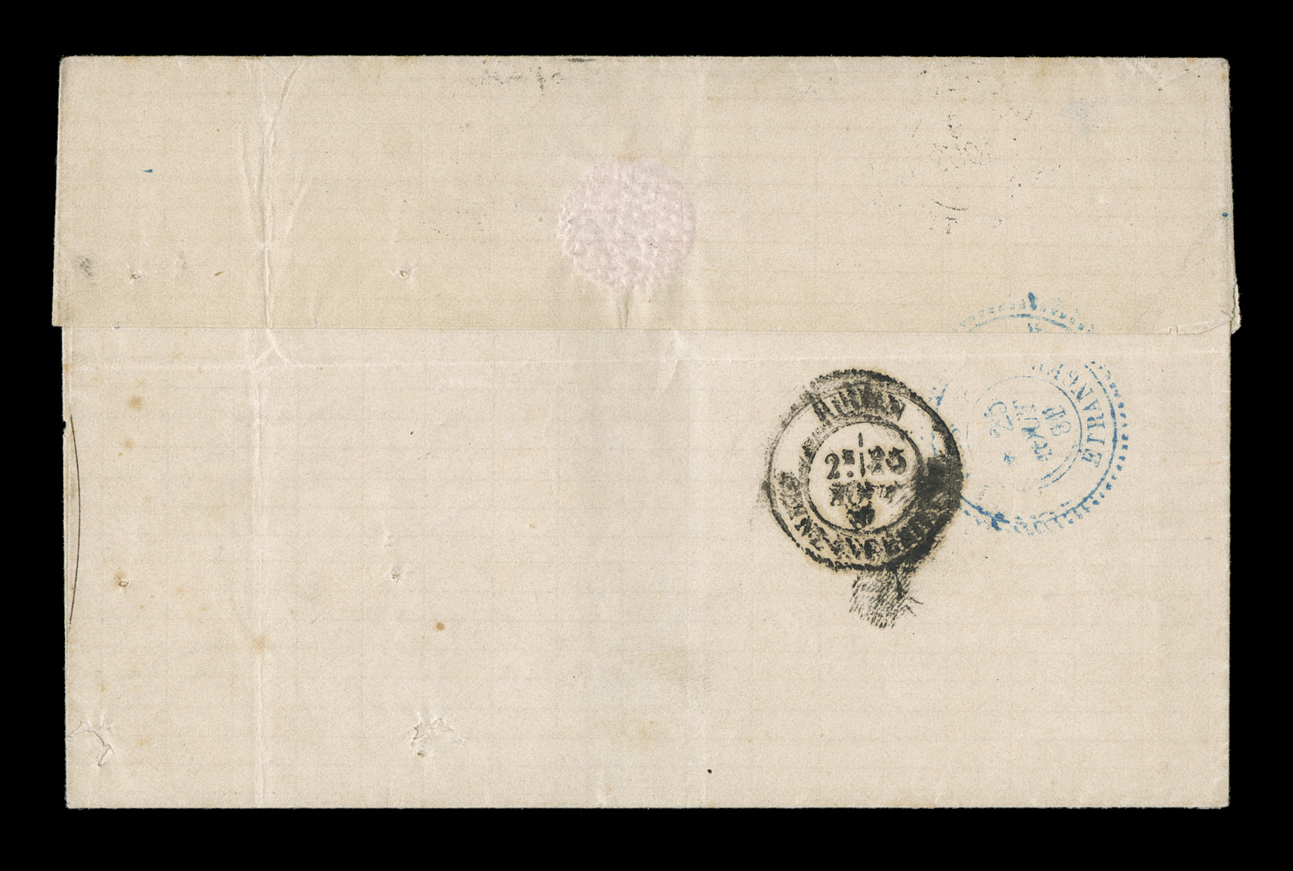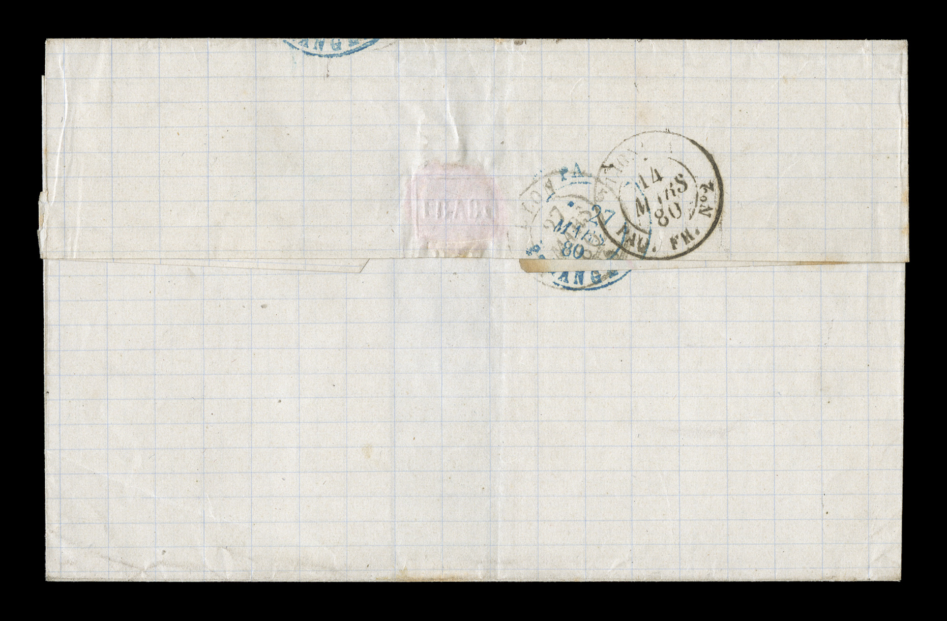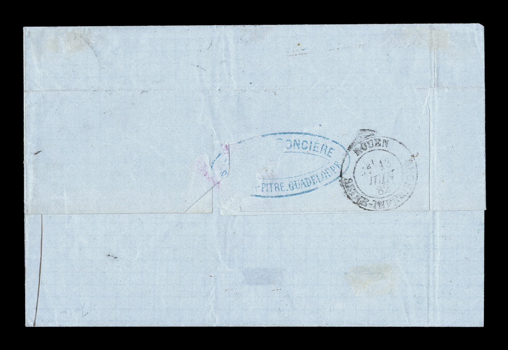 Guade10 Mai 79 double-circle sorting c.d.s. with an additional strikeFrench Colonies Yvert #23a, 1872 25c Blue, Ty. III, choice single with large even margins all around, tied to 1879 entire folded letter to France by "Paq. Fr./Pointe-a-Pitre Guade/10 Mai 79" double-circle sorting c.d.s. with an additional strike at right, carried by French packet with red octagonal packet transit of Line "A", backstamped Bordeaux, fresh and attractive, choice very fine; an early example of the 25c U.P.U. rate by French packet that went into effect on February 16, 1879 and thereafter. (imagea) (Image) Est. $150-200