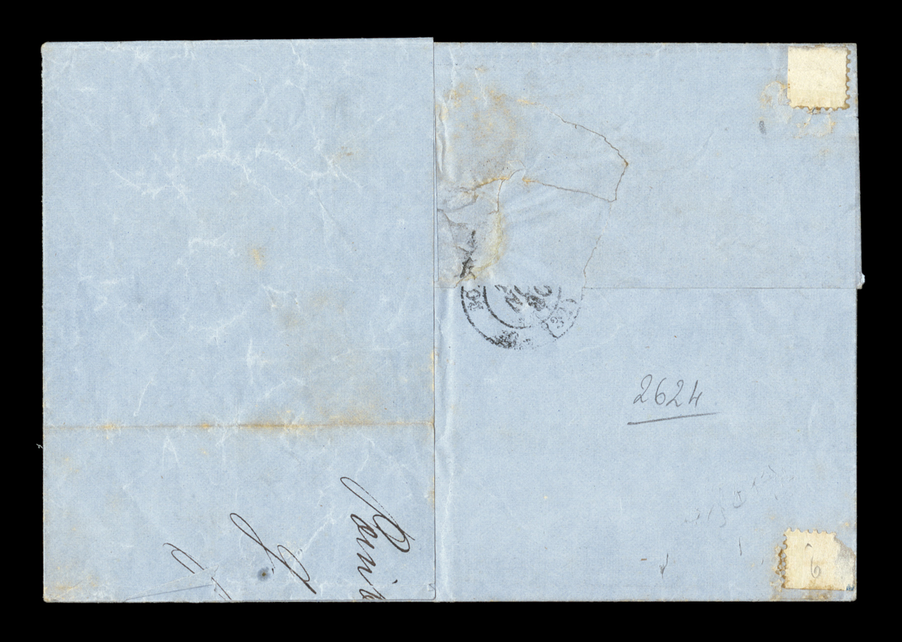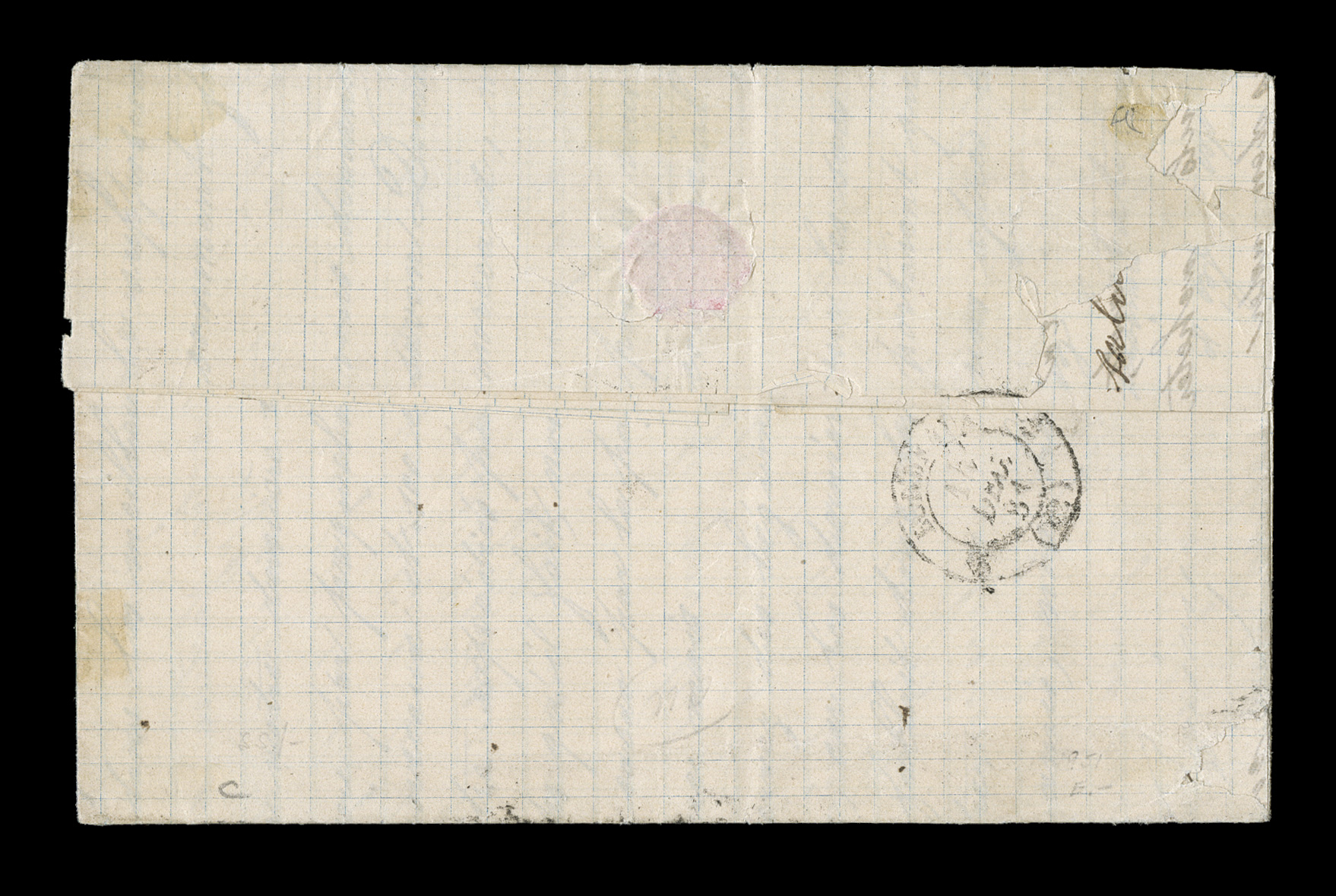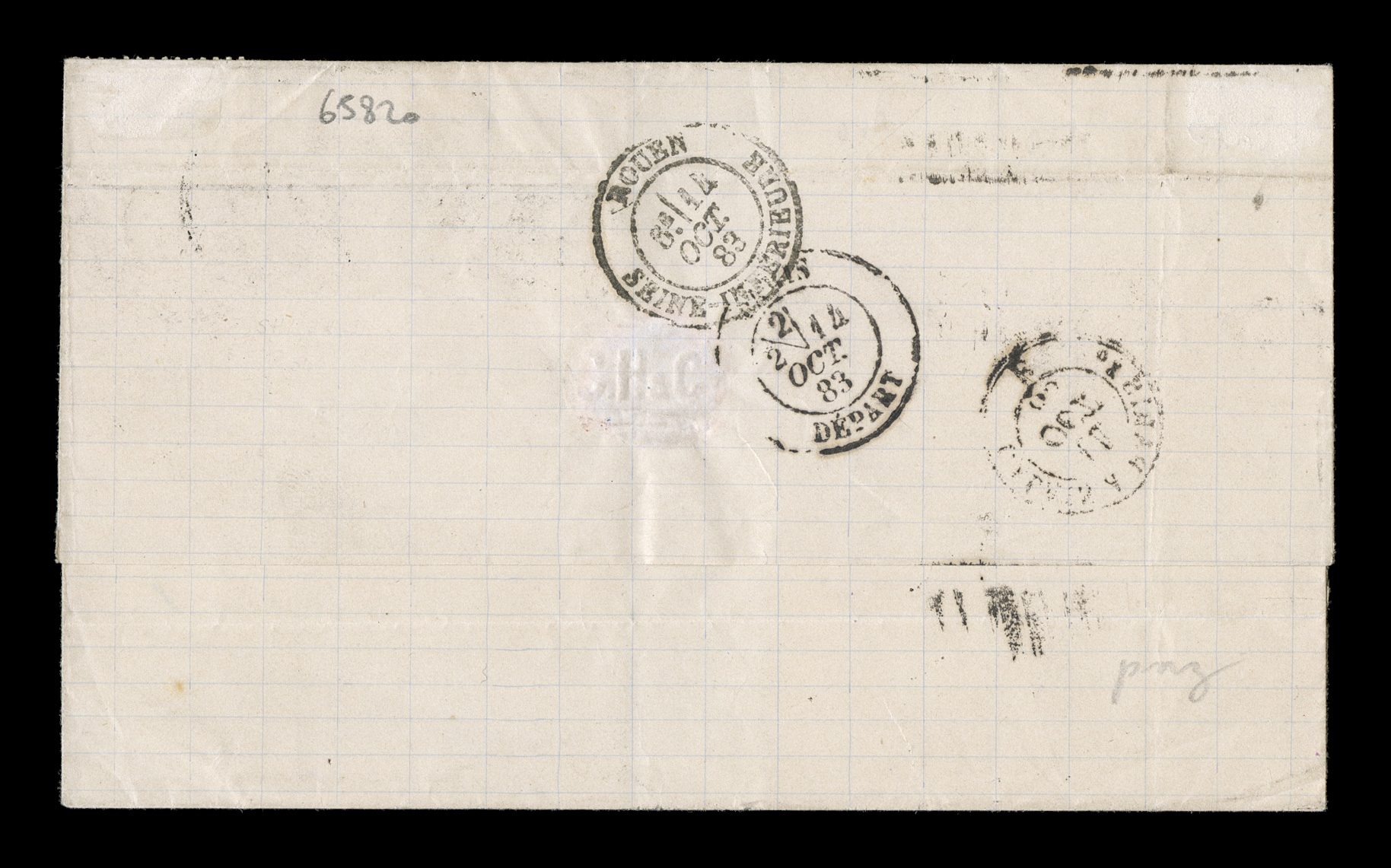 Guade10 Mai 79 double-circle sorting c.d.s. with an additional strikeFrench Colonies Yvert #23a, 1872 25c Blue, Ty. III, choice single with large even margins all around, tied to 1879 entire folded letter to France by "Paq. Fr./Pointe-a-Pitre Guade/10 Mai 79" double-circle sorting c.d.s. with an additional strike at right, carried by French packet with red octagonal packet transit of Line "A", backstamped Bordeaux, fresh and attractive, choice very fine; an early example of the 25c U.P.U. rate by French packet that went into effect on February 16, 1879 and thereafter. (imagea) (Image) Est. $150-200