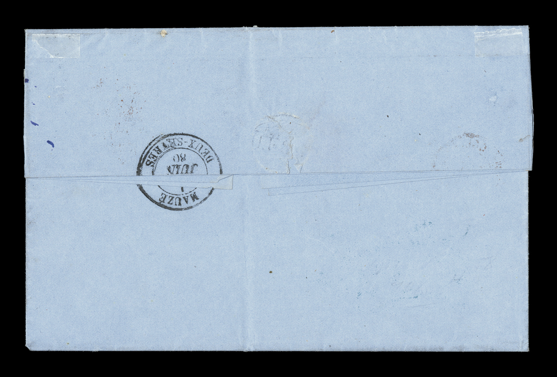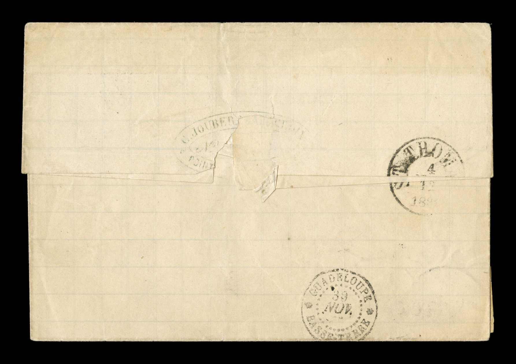 margined all around with a couple of partial scissors cuts between stFrench Colonies Yvert #17, 1872 5c Green on blue horizontal strip of five, impressive franking of a late usage of this value to pay the 25c U.P.U. rate to France, strip is well margined all around with a couple of partial scissors cuts between stamps, tied to 1880 entire folded letter carried by British packet by clear strikes of "Paq. Ang./Pointe-a-Pitre Guade./26 Mai 80" double-circle sorting c.d.s. with additional strike below, backstamped Mauze Dexu-Sevres, very fine and attractive; a very scarce franking. (imagea) (Image) Est. $750-1,000