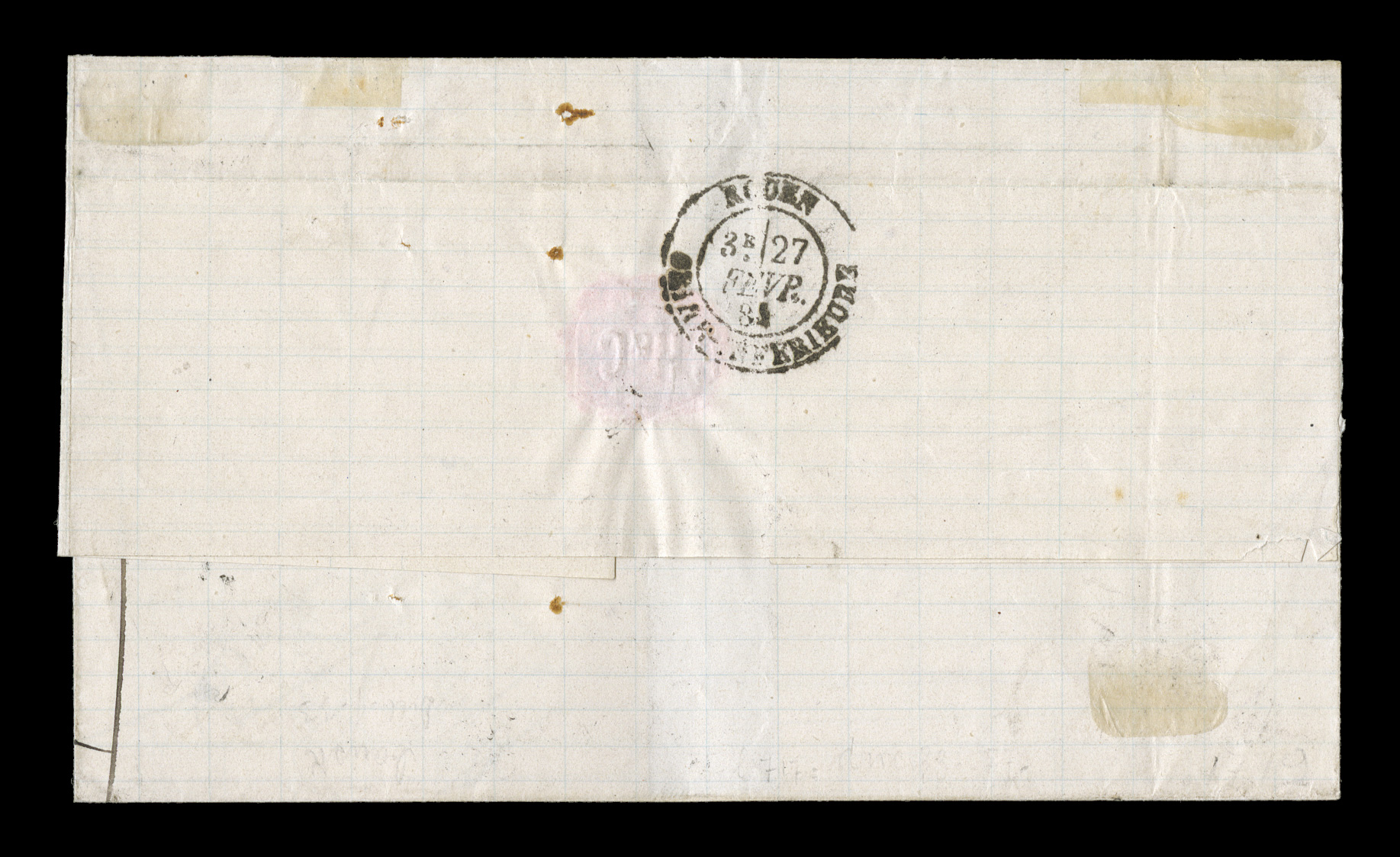 well struck Paq. Ang.Pointe-a-Pitre Guade10 Fevr. 79 double-cFrench Colonies Yvert #21, 1873 80c Rose horizontal pair, mostly clear to large margins, just touched at a couple points, tied to 1879 entire folded letter to New Brunswick, by well struck "Paq. Ang./Pointe-a-Pitre Guade/10 Fevr. 79" double-circle sorting c.d.s. with an additional strike at left, Basse Terre and Halifax transits on the reverse and backstamped Sackville, letter is fresh and intact and probably had an enclosure, couple of small stains to the pair from gum inclusions, still very fine and attractive; an extremely rare usage paying a double non-U.P.U. rate of 80c to New Brunswick; this is one of the very few rates that the 80c values applied to, lasting for a very short period; a pair paying the proper double-rate is an extraordinarily rare usage of this value. (imagea) (Image) Est. $750-1,000