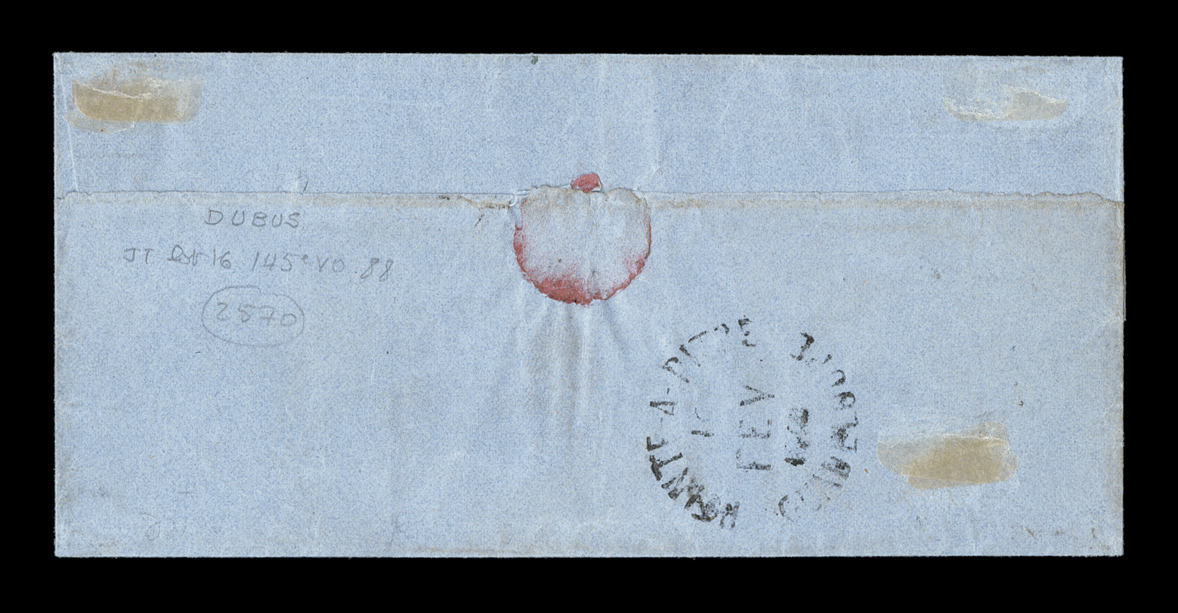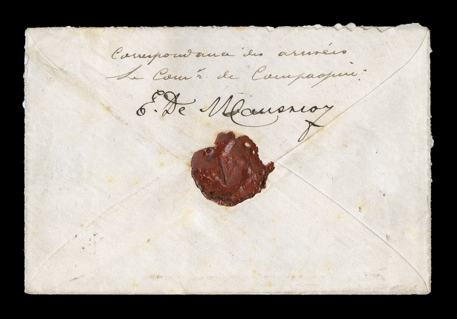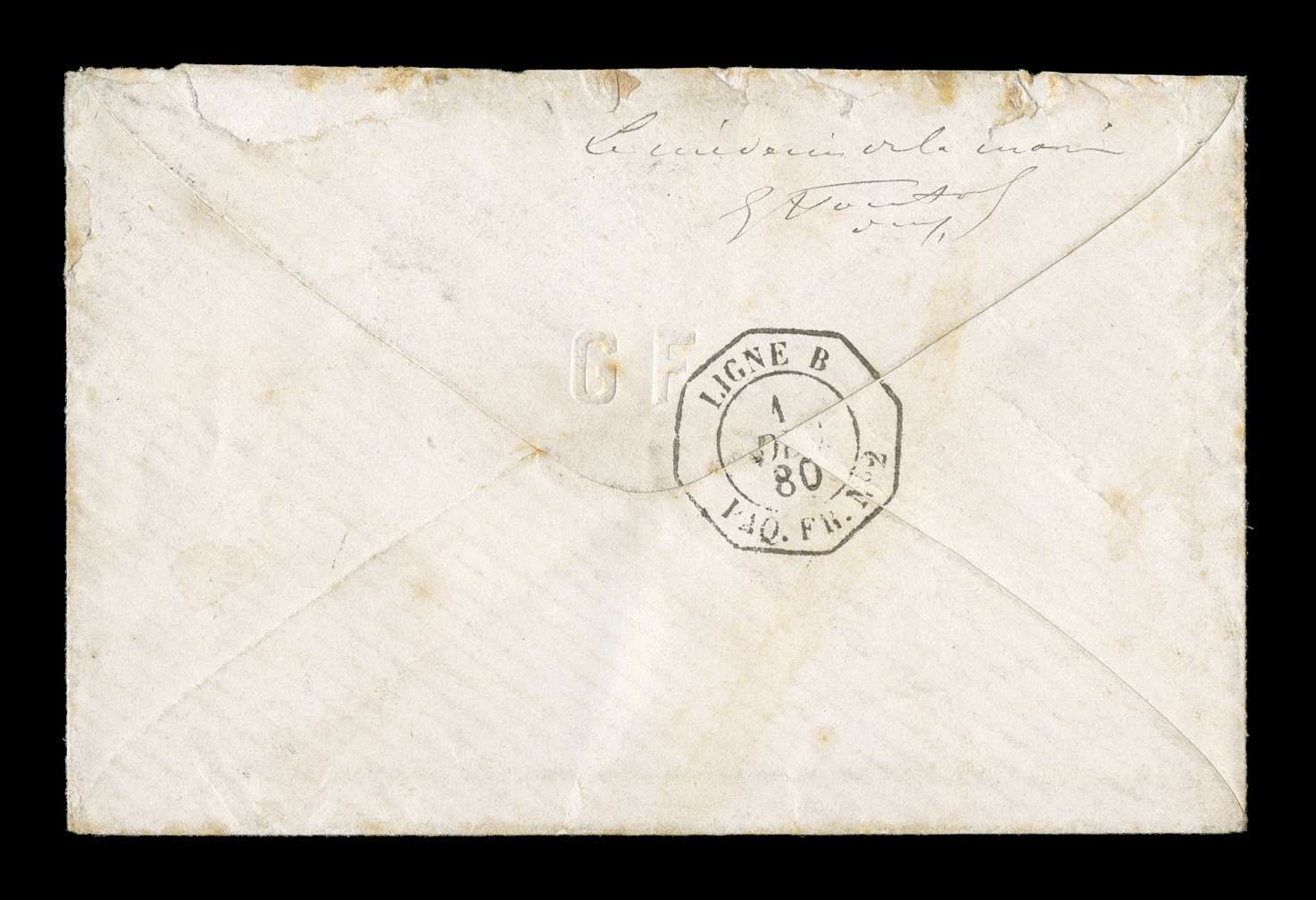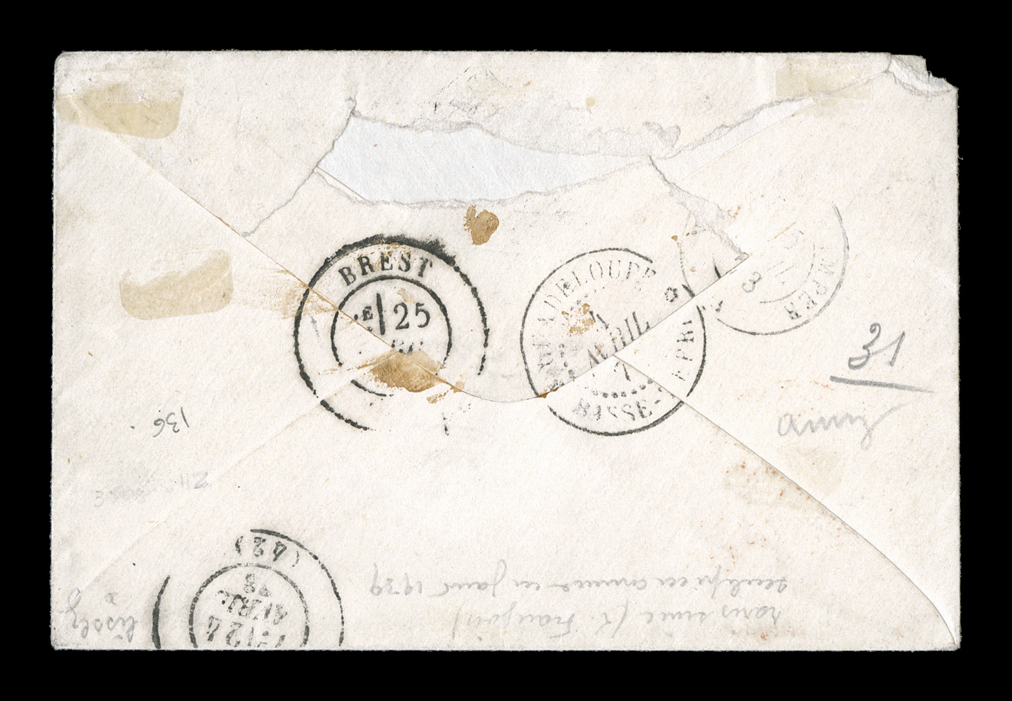 rate as opposed to the normal 25c U.P.U. rate, tied to small 1879 coveFrench Colonies Yvert #19, 1877 15c Bister, the scarce issue with thick numerals possessing large to extra-large margins, single franking paying the 15c military concessionary rate as opposed to the normal 25c U.P.U. rate, tied to small 1879 cover by rare black "Corr. D. Armees/Basse-Terre/23 Fevr. 79" octagonal military postmark, carried via French packet with red packet transit of Line "B" on the reverse, backstamped Orleans, portion of backflap missing removing most of the military endorsement on the reverse and small mended tear at top not affecting stamps or markings, otherwise very fine; an exceptionally rare military usage with this scarce franking; ex-Dubus. (imagea) (Image) Est. $1,500-2,000