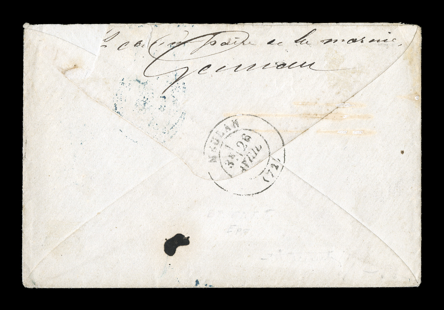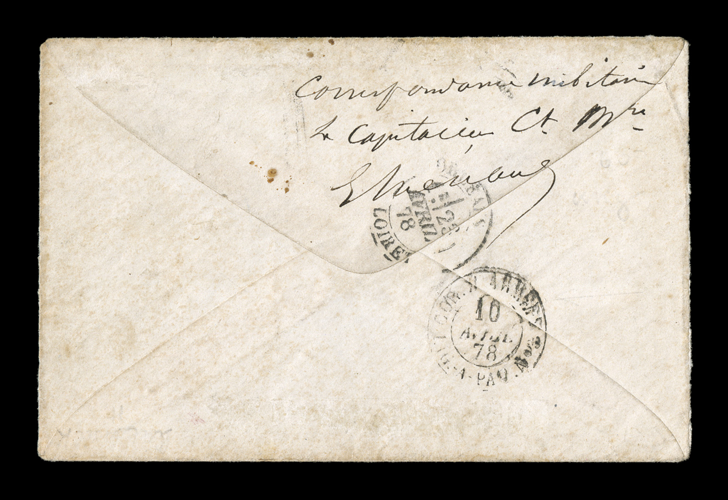 octagonal military postmark with an additional clear strike atFrench Colonies Yvert #23a, 1872 25c Blue, Ty.III, mostly large margins just touching at one corner, tied to small 1878 cover by black lozenge "Corr. D. Arm./Pte a Pitre/10 Avril 78" octagonal military postmark with an additional clear strike at left, carried on a French packet with military packet transit of Line "A" on the reverse and military endorsement, backstamped Orleans, trace of mild aging to the cover, very fine; this cover is in the transitional U.P.U. period when the normal packet rate to France was 40c for 15 grams; while Pointe-a-Pitre was the commercial center of Guadeloupe and many more covers originated there than at Basse Terre, that is not the case with military covers, which largely originated in Basse Terre, this military posting from Pointe-a-Pitre is decidedly rarer and seldom seen. (imagea) (Image) Est. $1,000-1,500