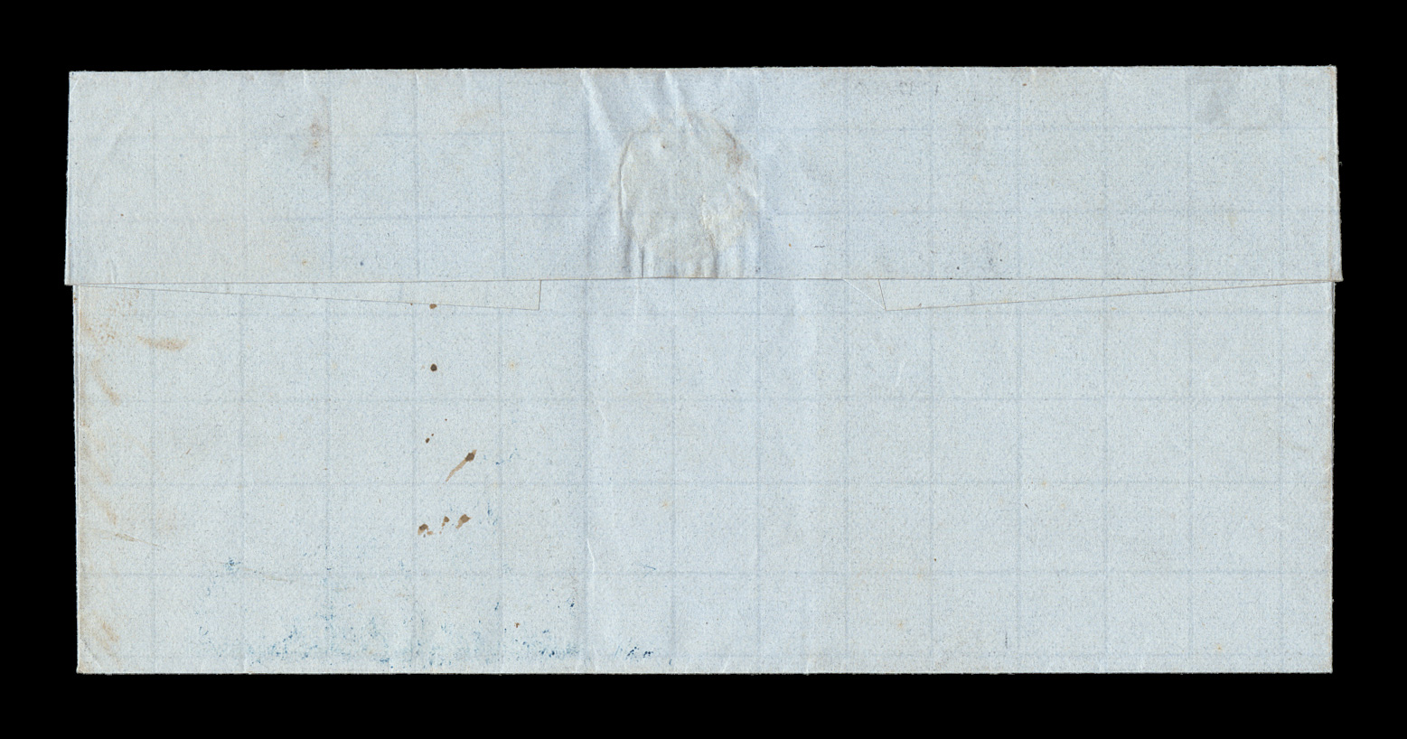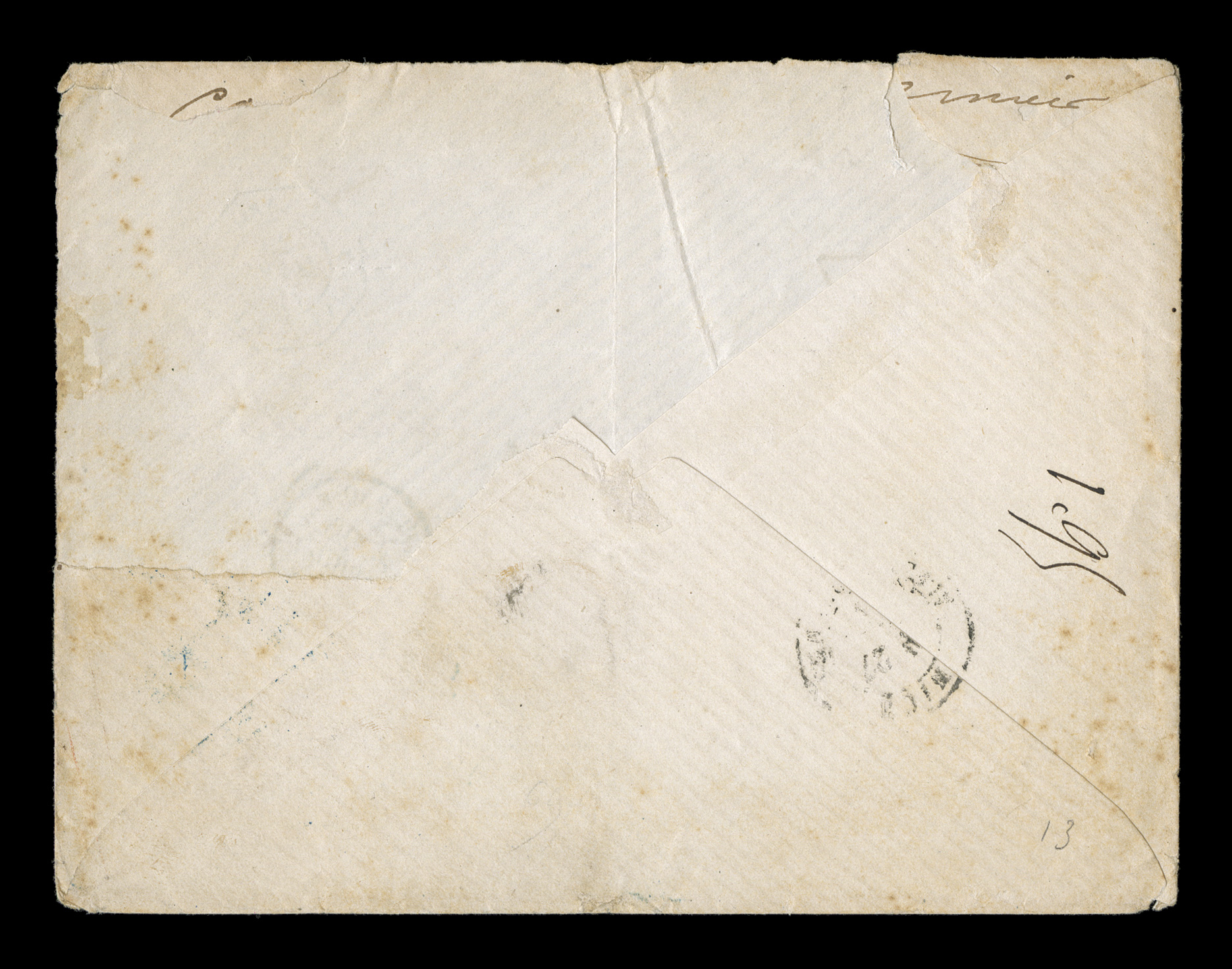 containing most of the endorsement), plus on the front is the extraordi1879 Saintes, Terre de Haut unpaid military cover to France, this cover was, in fact, endorsed as a military letter on the reverse by the commander (portion of back missing containing most of the endorsement), plus on the front is the extraordinarily rare blue "Corr. D. Armees/Saintes T.D.H./20 Mars 79" octagonal military postmark, however no postage was paid, which was not allowed even on military correspondence at this period, so the cover was marked due with a "5" decimes handstamp in blue for double the 25c U.P.U. regular non-military rate, matching blue St. Nazaire entry transit, backstamped Nice, edge tear to cover at top, fine; military covers from the Saintes Islands are especially rare but this military postmark of Terre de Haut is one of only two examples recorded; ex-Dubus. (imagea) (Image) Est. $3,000-4,000