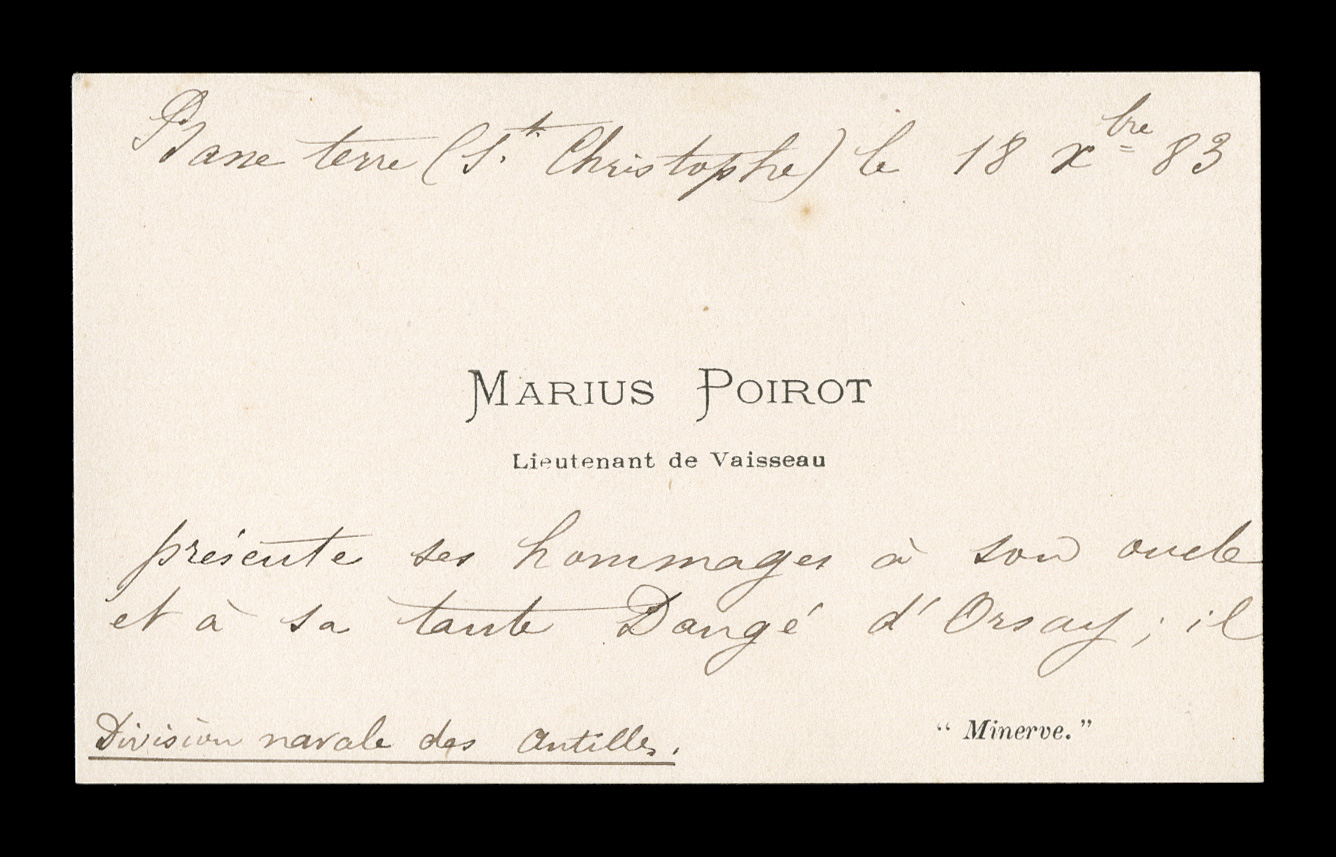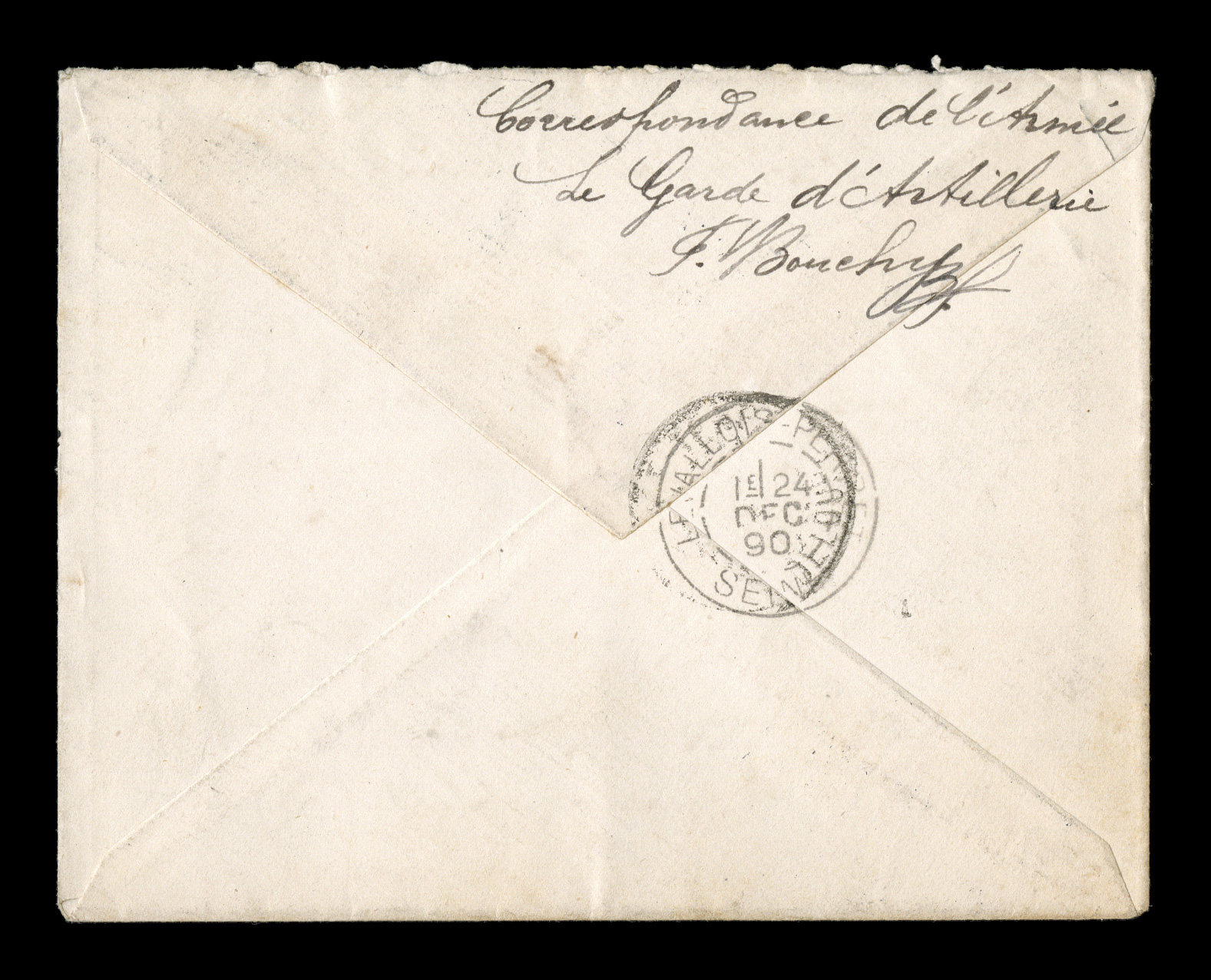 with nice matching strike at right, Bordeaux-Cette transit on the rFrench Colonies Yvert #51, 1881 15c Blue, very pretty small military cover with a fresh single tied by rare red "Cor. D. Armees/Lig.-B-Paq. No.1/26 Dec. 83" French packet c.d.s., with nice matching strike at right, Bordeaux-Cette transit on the reverse, backstamped Cahors, extremely fine and handsome cover; a most unusual military packet posting paying the 15c military rate, while not going through the Guadeloupe postal system, the Guadeloupe origin is confirmed by the card enclosure of Lieutenant Marius Poirot that is datelined Basse Terre. (imagea) (imageb) (imagec) (Image) Est. $1,000-1,500
