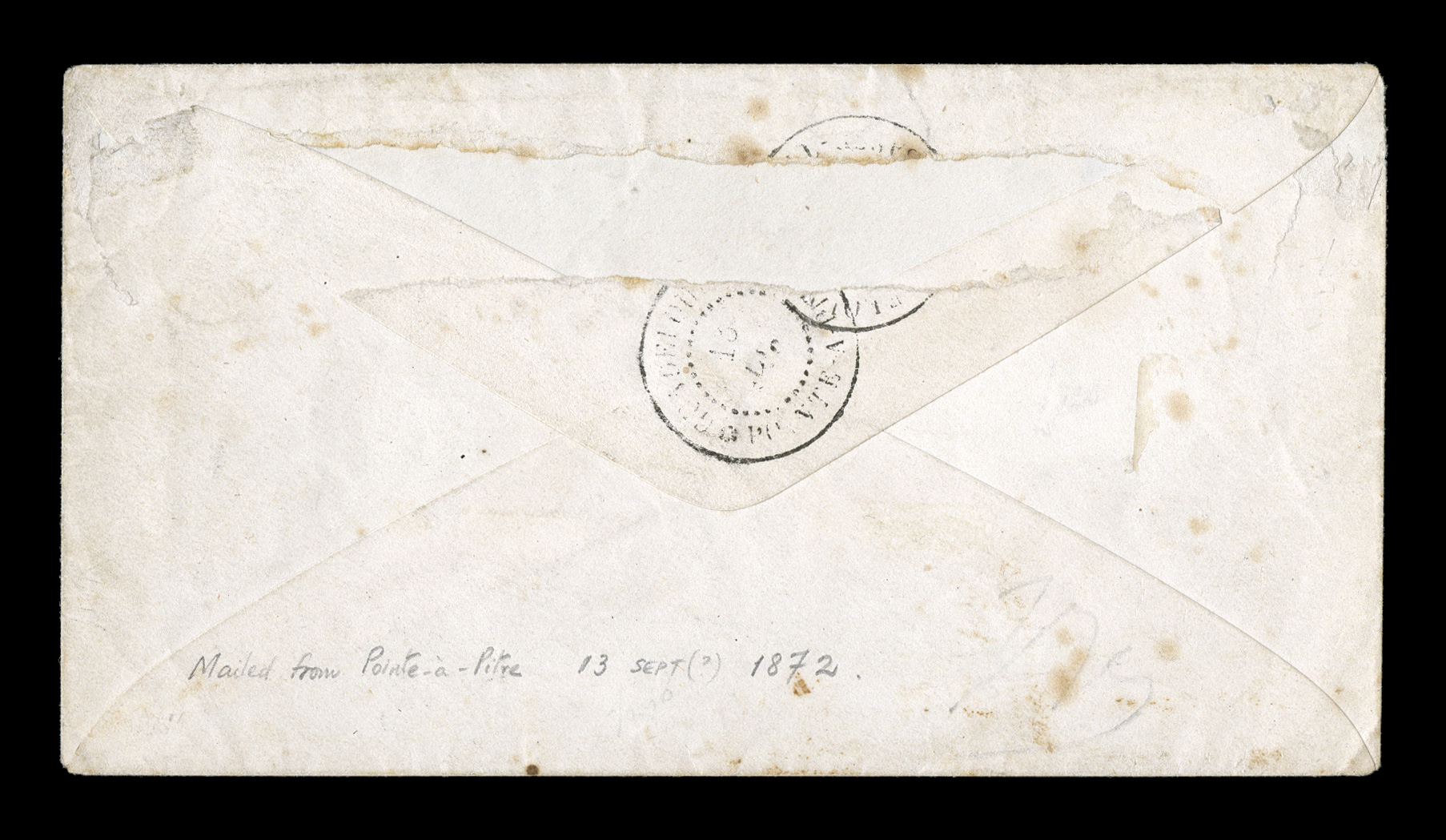 General issues, well clear to large margins, tiny nick in the top mFrench Colonies Yvert #8, 1872 5c Green horizontal strip of four, an impressive and extremely rare franking of the 5c Napoleon which is one of the scarcest of the French Colonies General issues, well clear to large margins, tiny nick in the top margin and tone spots to the left stamp (tone spots actually tie the strip to the cover), on 1872 cover to Basse Terre with two centrally struck 8x8 point lozenge cancels of Pointe-a-Pitre, portion of "Guadeloupe/Pointe-a-Pitre/13 Sept. 72" double-circle c.d.s. on the reverse, large black "P.P." handstamp, piece of backflap missing on opening, fine cover and an immensely rare franking; 1962 RPS certificate. (imagea) (Image) Est. $1,500-2,000