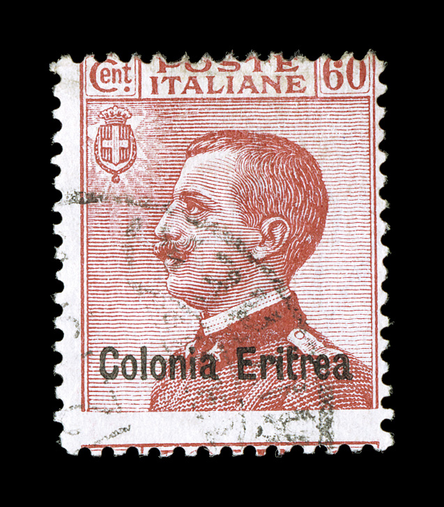 as usual, but clearly perceptible and rotated counter clockwise 90Sassone #48a, 1918 60c Carmine with "Colonia Eritrea" overprint, stamp printed on both sides, used example as all known examples are, the impression on the reverse is quite light as usual, but clearly perceptible and rotated counter clockwise 90 degrees showing portions of four different stamps, the front side has usual fine centering and possesses a portion of a black c.d.s. postmark, a very fine example of this scarce variety; signed A. D(iena) (Scott #44a; $1,000.00). (imagea) (Image) €1,500