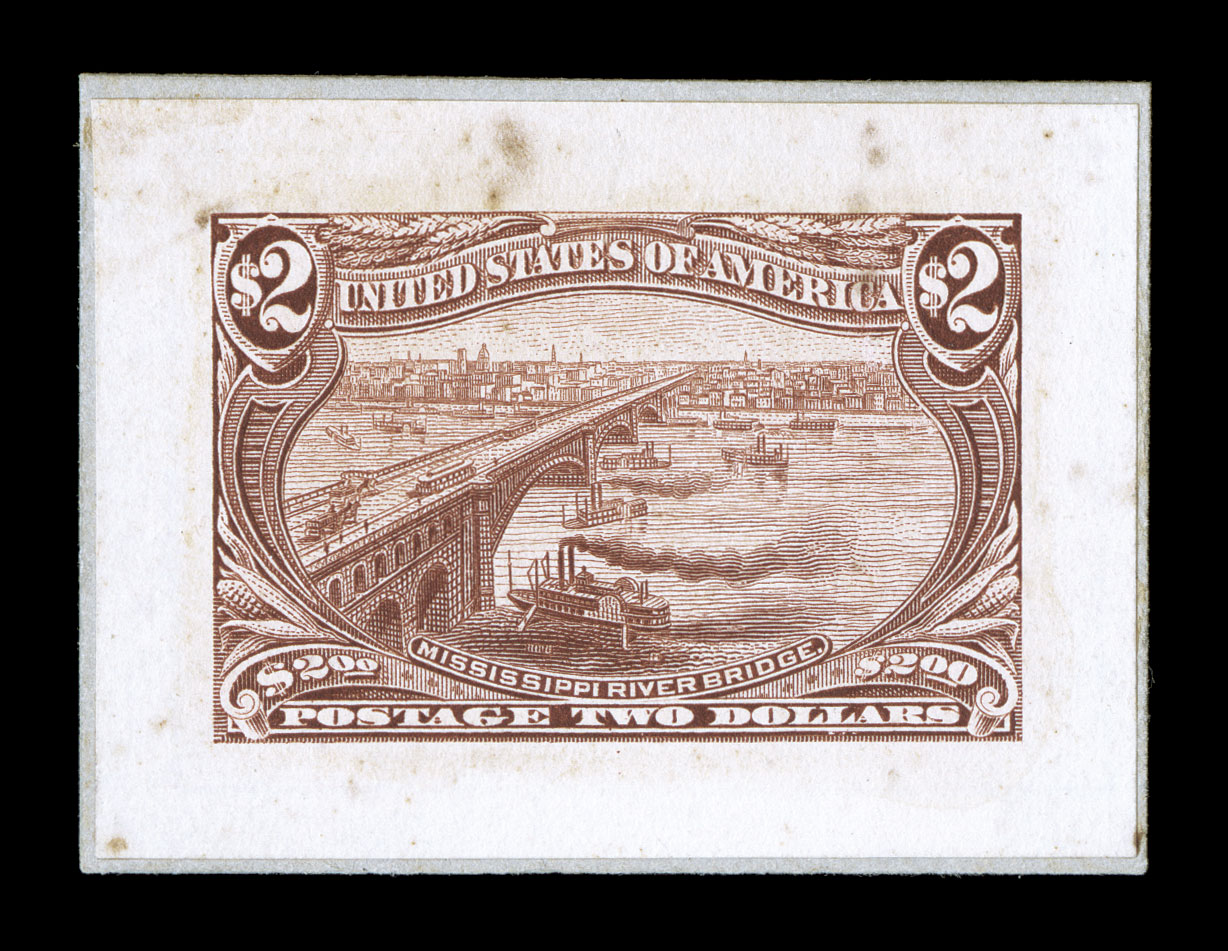 colors, $2.00 with some light toned specks mostly in the margin, otherwi#285P2-93P2, 1c-$2.00 Trans-Mississippis, small die proofs cplt., each mounted on a piece of the Roosevelt album page, all have exceptionally large margins and strong bright colors, $2.00 with some light toned specks mostly in the margin, otherwise an extremely fine and choice set of these rare proofs. (imagea) (Image) $5,850.00