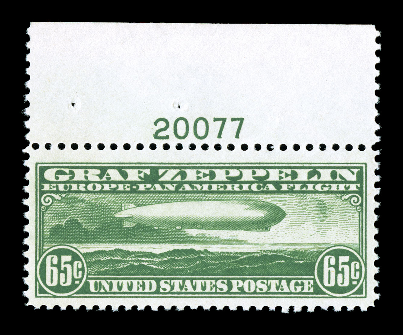 fresh white paper, unblemished o.g. without a single bend or skip, n.#C13, 65c Graf Zeppelin, a marvelous mint single, possessing exceptionally large and perfectly balanced margins all around, deep luxuriant color and a razor-sharp impression on fresh white paper, unblemished o.g. without a single bend or skip, n.h., extremely fine; a truly gem Sixty Five Cent Graf Zeppelin; 2005 PSE certificate (Superb 98; SMQ $2,000.00). (Image) $425.00