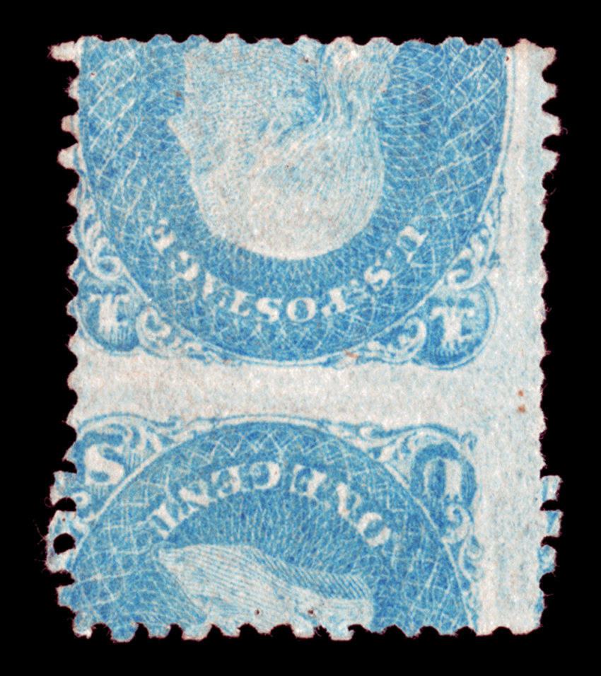 90c Carmine & Black (122). Vertical block of six, original gum, clearly-defined grills, rich colors and detailed impressions, long and full perforations all aroundEXTREMELY FINE. THIS IS BY FAR THE FINER OF THE TWO RECORDED ORIGINAL-GUM BLOCKS OF SIX OF THE 90-CENT 1869 PICTORIAL ISSUE, WHICH IS THE LARGEST RECORDED INTACT MULTIPLE. THIS BLOCK IS THE ONLY ONE WITH FULL ORIGINAL GUM. THE HIGHLIGHT OF THE CASPARY AND EUBANKS 1869 PICTORIAL ISSUE COLLECTIONS AND ONE OF THE MOST IMPORTANT CLASSIC UNITED STATES BLOCKS EXTANT. The contract for the 1869 Pictorial Issue was awarded to National Bank Note Co. in February 1869 by the outgoing Johnson administration (Grant was inaugurated March 4, 1869). Three of the ten stamps had traditional portraits: the 1c Franklin, 6c Washington and 90c Lincoln. The other values represented a radical departure from the portraiture of all previous issues, depicting scenes of fast communication and historical events. Contemporary critical review was unexpectedly negative. While preceding issues had been current for 7 to 10 years and the 1870 Bank Note issue lasted 18 years, not even a year was given to the 1869 Pictorial Issue. For the 90c, the portrait of Lincoln was admired, but the "prison bars" behind his head were criticized. The 90c stamps were intended to be used on heavy domestic packages or on multiple-rate mail to foreign destinations. Given the high cost of the stamp (equivalent to $14.33 in today's money), the 90c 1869's were not bought in any quantity to be stored and used later, as was the case with lower-denomination stamps. With the reduction in many foreign treaty rates, the 90c could only be used on multiple-rate letters. The short lifespan of the 1869 Pictorial Issue closed the window of opportunity for the public to buy the 90c Lincoln stamps at the post office. Only one 90c on cover is recorded: the famous "Ice House" cover, sold by the Siegel firm for $375,000 hammer. There are two recorded unused blocks of six, the largest recorded unused multiples: 1) full original gum, sound, the block offered here, ex Caspary, Kapiloff and Joseph, and 2) traces of original gum, slightly dry print at right, right center stamp small thin spot, perfs strengthened and rejoined, ex Hind, Bechtel, Zoellner and Ainsworth (now in the Gross collection). There is also a reconstructed unused block of eight (ex Lafayette). Ex Caspary, Kapiloff and Joseph. With 2010 P.F. certificate. Unpriced in Scott Catalogue as a block of six |